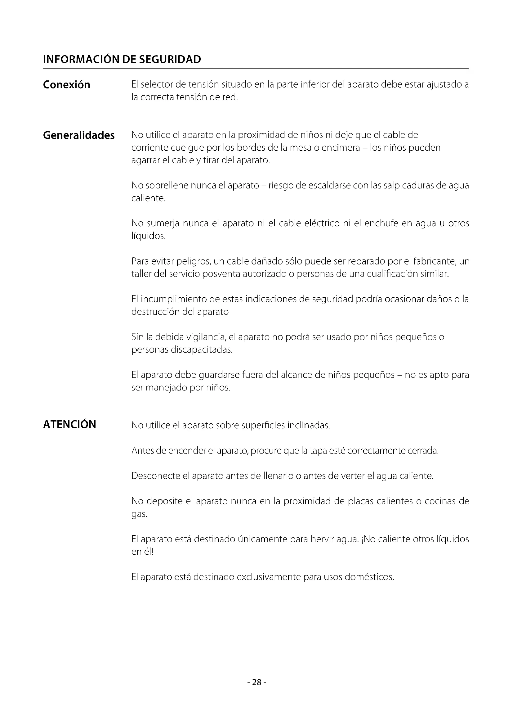 Generalidades El selector de tensión situado en la parte inferior del aparato debe estar ajustado a la correcta tensión de red. No utilice el aparato en la proximidad de niños ni deje que el cable de corriente cuelgue por los bordes de la mesa o encimera – los niños pueden agarrar el cable y tirar del aparato. No sobrellene nunca el aparato – riesgo de escaldarse con las salpicaduras de agua caliente. No sumerja nunca el aparato ni el cable eléctrico ni el enchufe en agua u otros líquidos. Para evitar peligros, un cable dañado sólo puede ser reparado por el fabricante, un taller del servicio posventa autorizado o personas de una cualicación similar. El incumplimiento de estas indicaciones de seguridad podría ocasionar daños o la destrucción del aparato Sin la debida vigilancia, el aparato no podrá ser usado por niños pequeños o personas discapacitadas. El aparato debe guardarse fuera del alcance de niños pequeños – no es apto para ser manejado por niños. No utilice el aparato sobre supercies inclinadas. Antes de encender el aparato, procure que la tapa esté correctamente cerrada. Desconecte el aparato antes de llenarlo o antes de verter el agua caliente. No deposite el aparato nunca en la proximidad de placas calientes o cocinas de gas. El aparato está destinado únicamente para hervir agua. ¡No caliente otros líquidos en él! El aparato está destinado exclusivamente para usos domésticos. Conexión