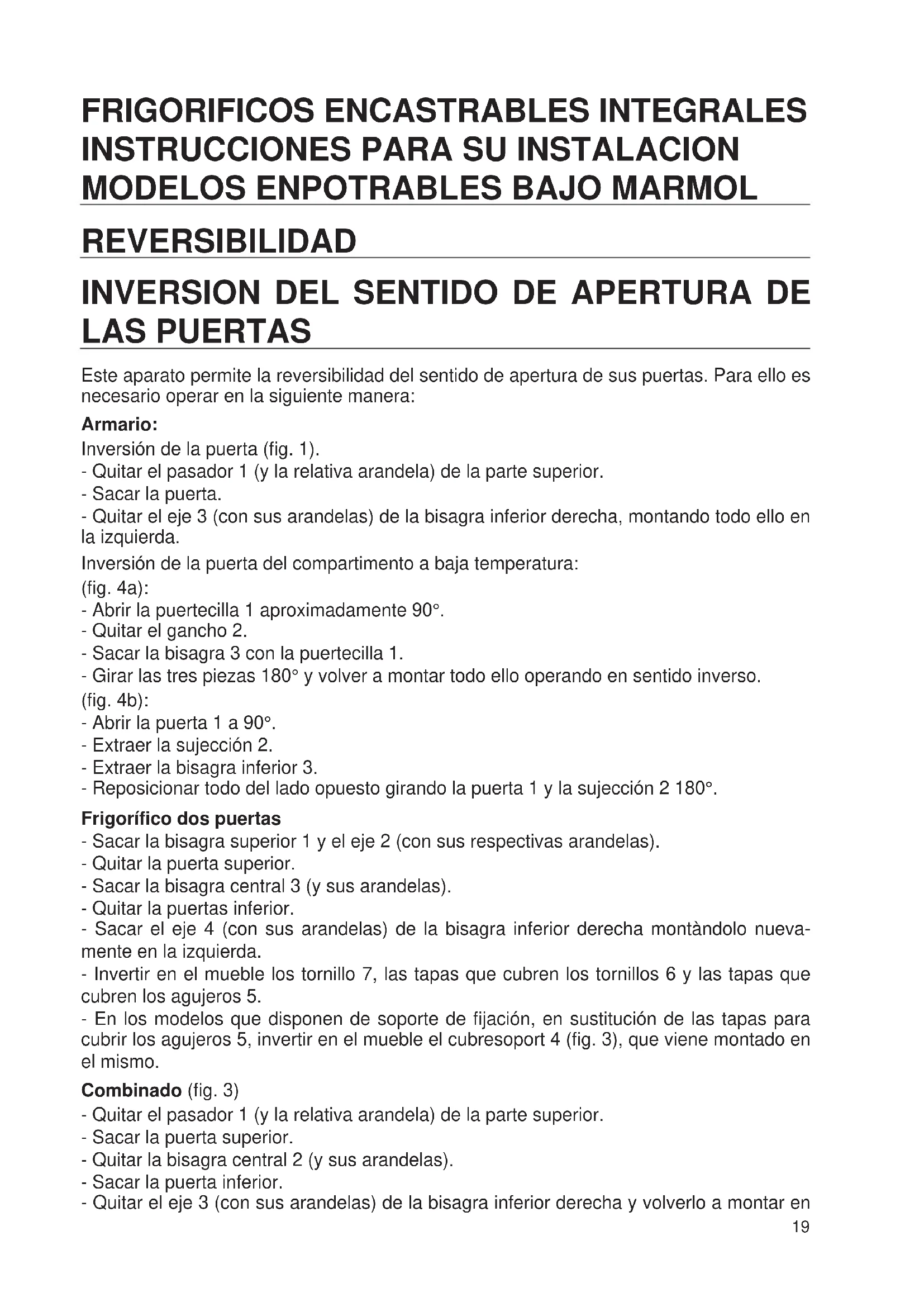 LAS PUERTAS Este aparato permite la reversibilidad del sentido de apertura de sus puertas. Para ello es necesario operar en la siguiente manera: Armario: Inversión de la puerta (fig. 1). - Quitar el pasador 1 (y la relativa arandela) de la parte superior. - Sacar la puerta. - Quitar el eje 3 (con sus arandelas) de la bisagra inferior derecha, montando todo ello en la izquierda. Inversión de la puerta del compartimento a baja temperatura: (fig. 4a): - Abrir la puertecilla 1 aproximadamente 90°. - Quitar el gancho 2. - Sacar la bisagra 3 con la puertecilla 1. - Girar las tres piezas 180° y volver a montar todo ello operando en sentido inverso. (fig. 4b): - Abrir la puerta 1 a 90°. - Extraer la sujección 2. - Extraer la bisagra inferior 3. - Reposicionar todo del lado opuesto girando la puerta 1 y la sujección 2 180°. Frigorífico dos puertas - Sacar la bisagra superior 1 y el eje 2 (con sus respectivas arandelas). - Quitar la puerta superior. - Sacar la bisagra central 3 (y sus arandelas). - Quitar la puertas inferior. - Sacar el eje 4 (con sus arandelas) de la bisagra inferior derecha montàndolo nueva- mente en la izquierda. - Invertir en el mueble los tornillo 7, las tapas que cubren los tornillos 6 y las tapas que cubren los agujeros 5. - En los modelos que disponen de soporte de fijación, en sustitución de las tapas para cubrir los agujeros 5, invertir en el mueble el cubresoport 4 (fig. 3), que viene montado en el mismo. Combinado (fig. 3) - Quitar el pasador 1 (y la relativa arandela) de la parte superior. - Sacar la puerta superior. - Quitar la bisagra central 2 (y sus arandelas). - Sacar la puerta inferior. - Quitar el eje 3 (con sus arandelas) de la bisagra inferior derecha y volverlo a montar en 19la bisagra inferior izquierda. - Invertir en el mueble el cubresoporte 4 montado sobre el mismo.