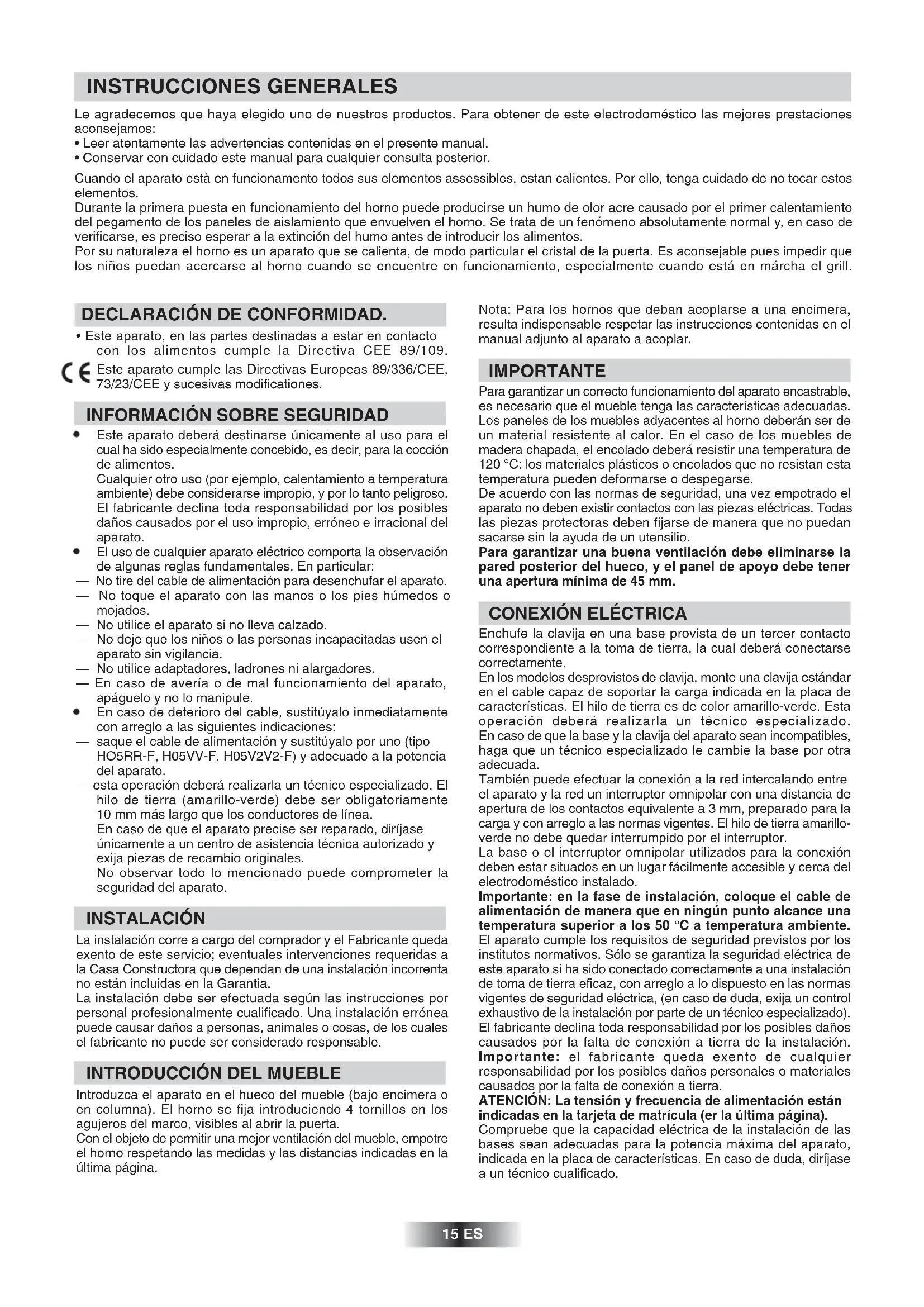 - Conservar con cuidado este manual para cualquier consulta posterior. Cuando el aparato està en funcionamento todos sus elementos assessibles, estan calientes. Por ello, tenga cuidado de no tocar estos elementos. Durante la primera puesta en funcionamiento del horno puede producirse un humo de olor acre causado por el primer calentamiento del pegamento de los paneles de aislamiento que envuelven el horno. Se trata de un fenómeno absolutamente normal y, en caso de verificarse, es preciso esperar a la extinción del humo antes de introducir los alimentos. Por su naturaleza el horno es un aparato que se calienta, de modo particular el cristal de la puerta. Es aconsejable pues impedir que los niños puedan acercarse al horno cuando se encuentre en funcionamiento, especialmente cuando está en márcha el grill. INSTRUCCIONES GENERALES 15 ES DECLARACIÓN DE CONFORMIDAD.