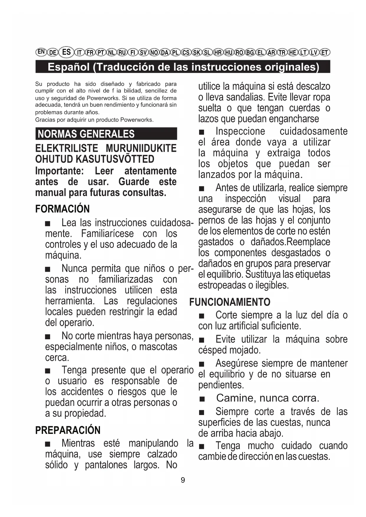 DE ES IT FR PT NL RU FI SV NO DA PL CS SK SL HR HU RO BG EL AR TR HE LT LV ET Su producto ha sido diseñado y fabricado para cumplir con el alto nivel de f ia bilidad, sencillez de uso y seguridad de Powerworks. Si se utiliza de forma adecuada, tendrá un buen rendimiento y funcionará sin problemas durante años. Gracias por adquirir un producto Powerworks. NORMAS GENERALES ELEKTRILISTE MURUNIIDUKITE