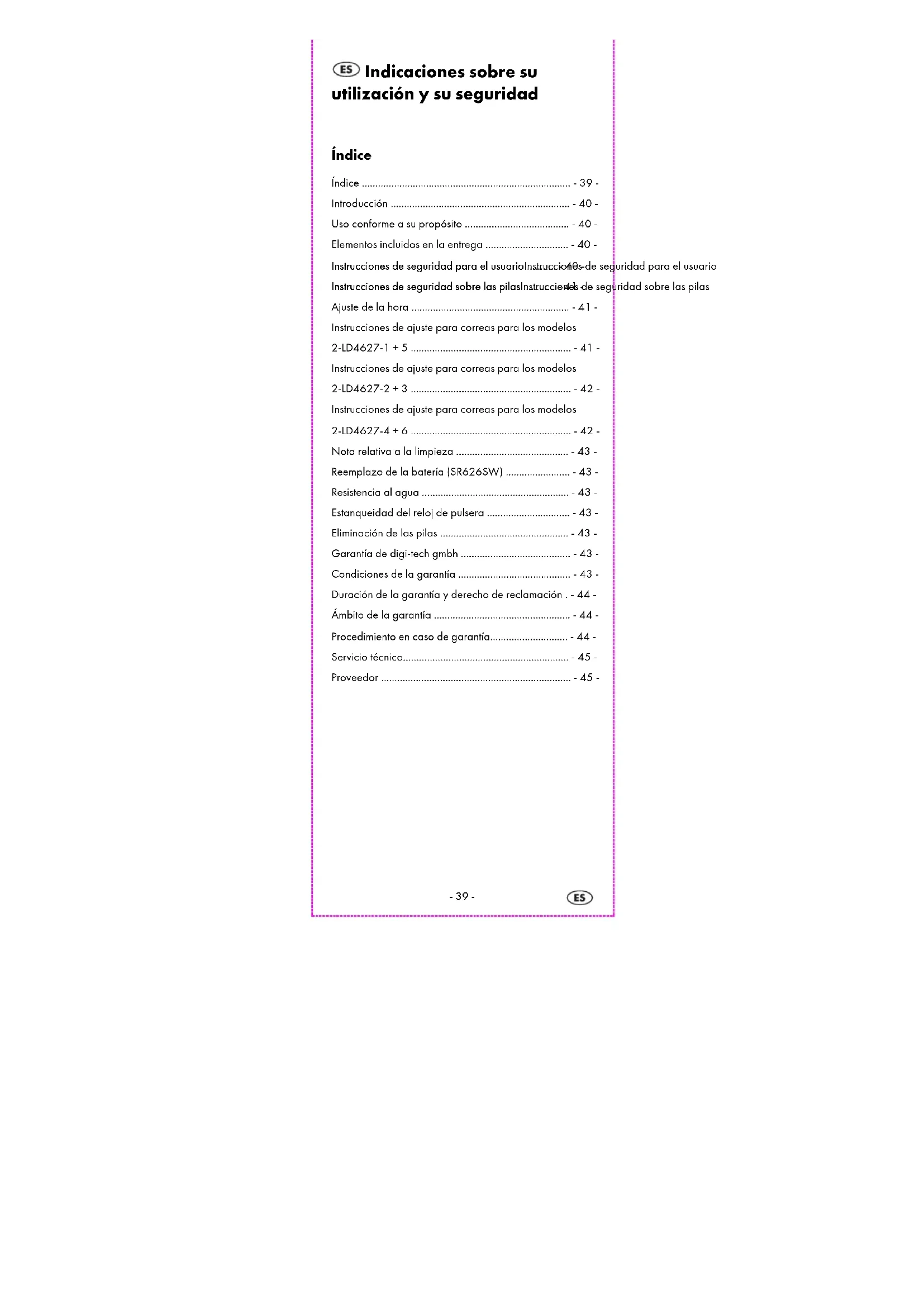 Indicaciones sobre su utilización y su seguridad Índice Índice .............................................................................. - 39 - Introducción ................................................................... - 40 - Uso conforme a su propósito ....................................... - 40 - Elementos incluidos en la entrega ............................... - 40 - Instrucciones de seguridad para el usuario Instrucciones de seguridad para el usuarioInstrucciones de seguridad para el usuario Instrucciones de seguridad para el usuario ........... - 40 - Instrucciones de seguridad sobre las pilas Instrucciones de seguridad sobre las pilasInstrucciones de seguridad sobre las pilas Instrucciones de seguridad sobre las pilas ............ - 41 - Ajuste de la hora ........................................................... - 41 - Instrucciones de ajuste para correas para los modelos 2-LD4627-1 + 5 ............................................................ - 41 - Instrucciones de ajuste para correas para los modelos 2-LD4627-2 + 3 ............................................................ - 42 - Instrucciones de ajuste para correas para los modelos 2-LD4627-4 + 6 ............................................................ - 42 - Nota relativa a la limpieza .......................................... - 43 - Reemplazo de la batería (SR626SW) ........................ - 43 - Resistencia al agua ....................................................... - 43 - Estanqueidad del reloj de pulsera ............................... - 43 - Eliminación de las pilas ................................................ - 43 - Garantía de digi-tech gmbh ......................................... - 43 - Condiciones de la garantía .......................................... - 43 - Duración de la garantía y derecho de reclamación . - 44 - Ámbito de la garantía ................................................... - 44 - Procedimiento en caso de garantía............................. - 44 - Servicio técnico.............................................................. - 45 - Proveedor ....................................................................... - 45 --