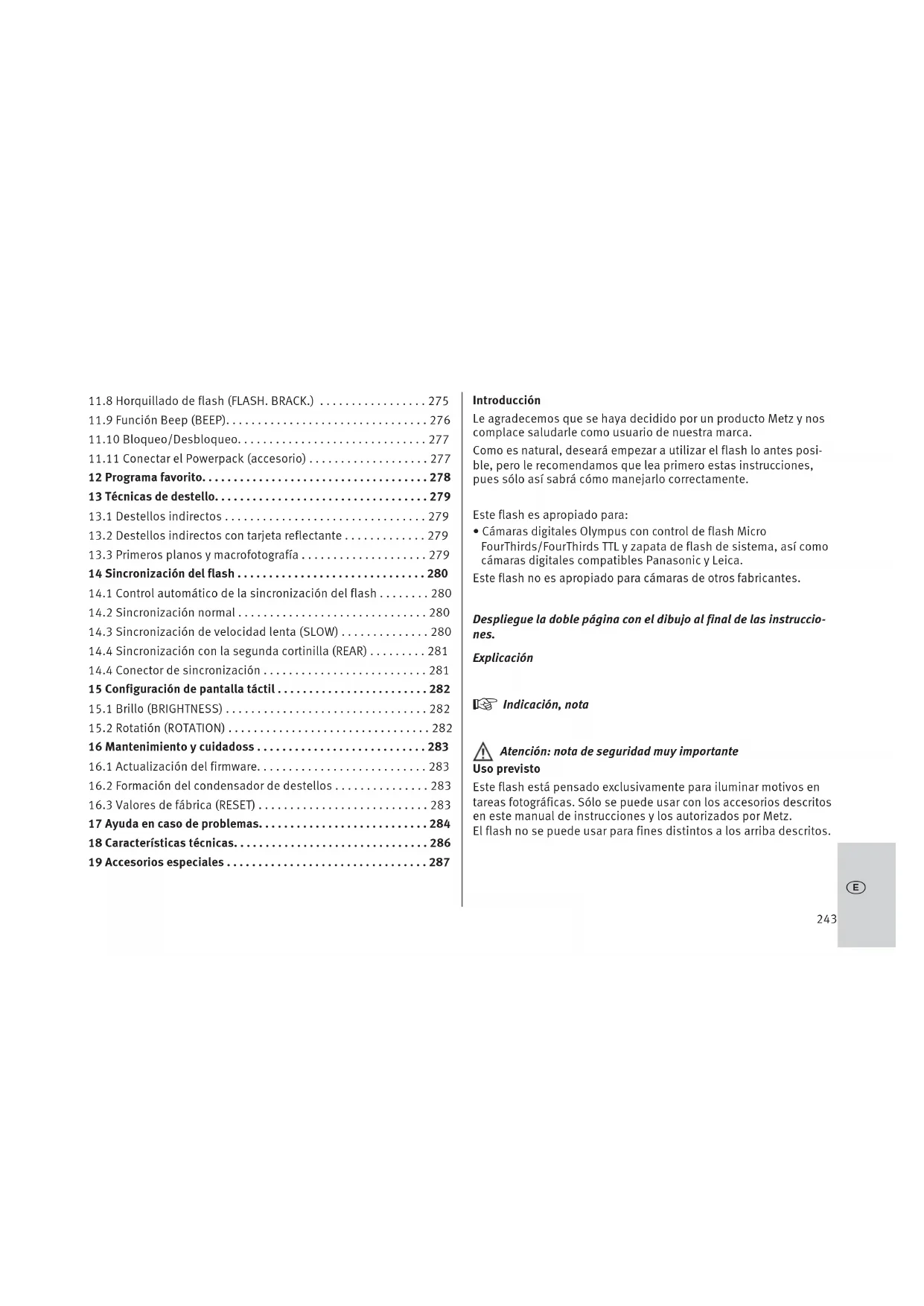 - Cámaras digitales Olympus con control de flash Micro FourThirds/FourThirds TTL y zapata de flash de sistema, así como cámaras digitales compatibles Panasonic y Leica. Este flash no es apropiado para cámaras de otros fabricantes. Despliegue la doble página con el dibujo al final de las instruccio- nes. Explicación Indicación, nota Atención: nota de seguridad muy importante Uso previsto Este flash está pensado exclusivamente para iluminar motivos en tareas fotográficas. Sólo se puede usar con los accesorios descritos en este manual de instrucciones y los autorizados por Metz. El flash no se puede usar para fines distintos a los arriba descritos.