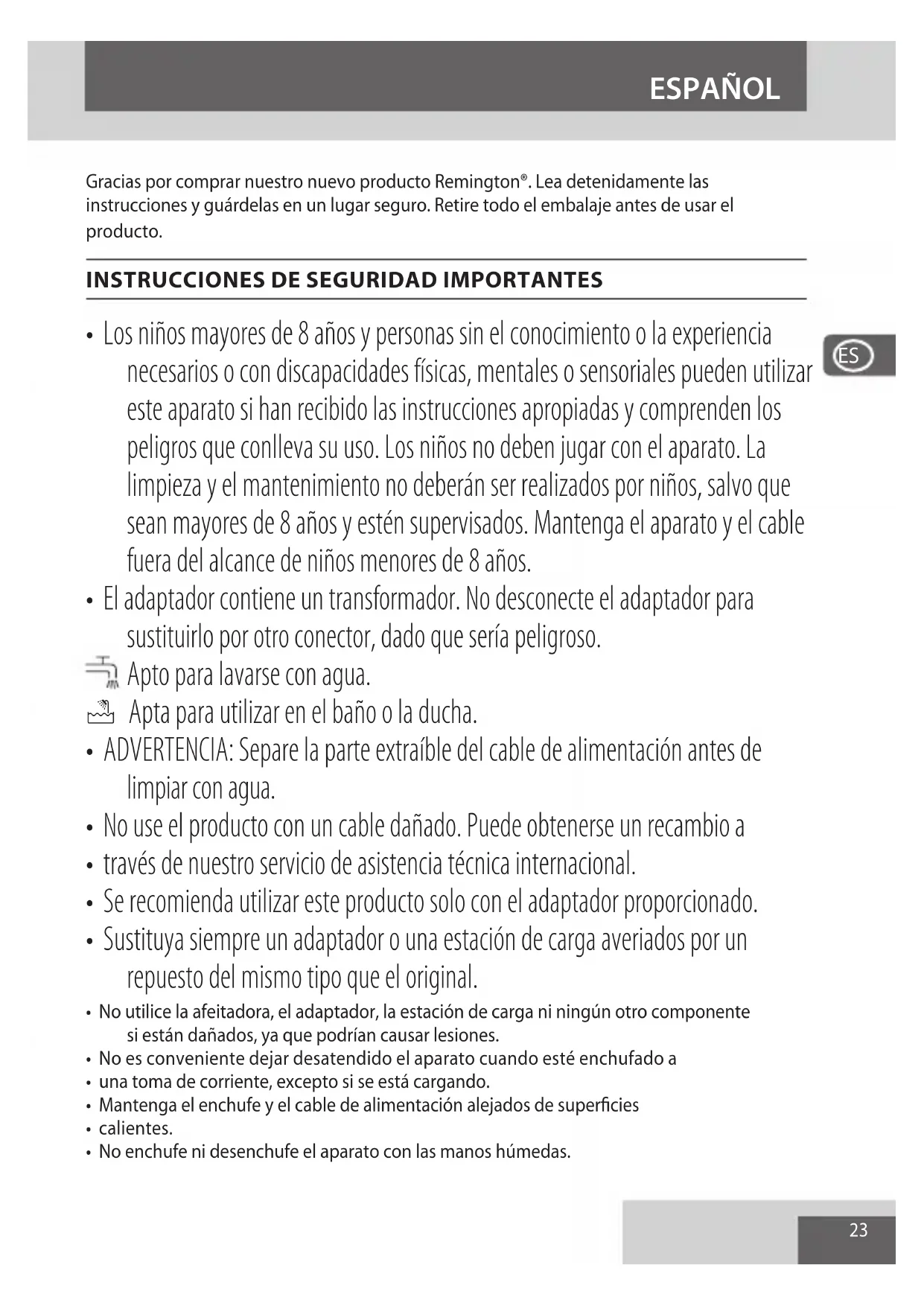Para evitar problemas medioambientales y de salud derivados de sustancias peligrosas, los electrodomésticos y las pilas recargables y no recargables en las que aparezca uno de estos símbolos no deben eliminarse junto con los residuos urbanos no seleccionados. Deseche siempre los aparatos eléctricos y electrónicos y, cuando corresponda, las pilas recargables y no recargables, en puntos ociales de recogida/ reciclado adecuados.28 Grazie per aver acquistato il vostro nuovo prodotto Remington®. Prima dell’uso, leggere attentamente le istruzioni e conservarle. Rimuovere tutto l’imballaggio prima dell’uso.
