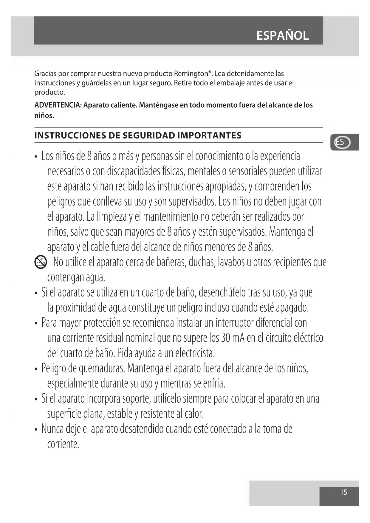 - A fin de evitar riesgos, si el cable resultase dañado, deje de utilizar el aparato inmediatamente y devuélvalo al distribuidor autorizado de Remington® más cercano para su reparación o sustitución.