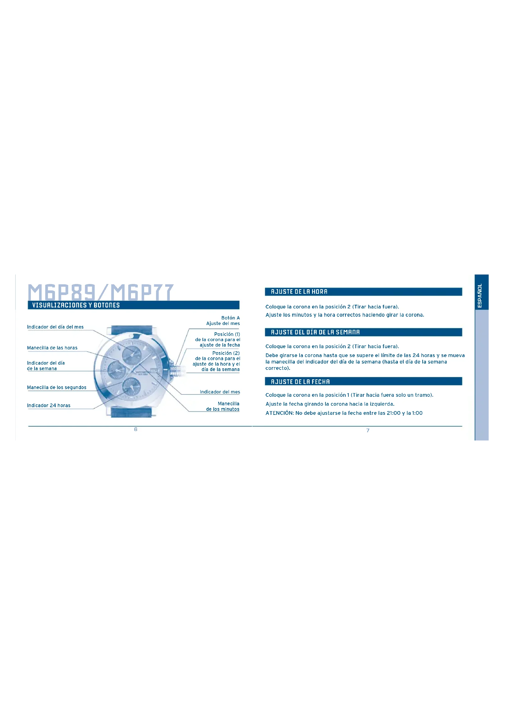 Coloque la corona en la posición 2 (Tirar hacia fuera). Ajuste los minutos y la hora correctos haciendo girar la corona. Coloque la corona en la posición 2 (Tirar hacia fuera). Debe girarse la corona hasta que se supere el límite de las 24 horas y se mueva la manecilla del indicador del día de la semana (hasta el día de la semana correcto). Coloque la corona en la posición 1 (Tirar hacia fuera solo un tramo). Ajuste la fecha girando la corona hacia la izquierda. ATENCIÓN: No debe ajustarse la fecha entre las 21:00 y la 1:00 M6P89/M6P77 Indicador del día del mes Botón A Ajuste del mes Indicador del mes Manecilla de los minutos Posición (1) de la corona para el ajuste de la fecha Posición (2) de la corona para el ajuste de la hora y el día de la semana Manecilla de las horas Indicador del día de la semana Manecilla de los segundos Indicador 24 horas8