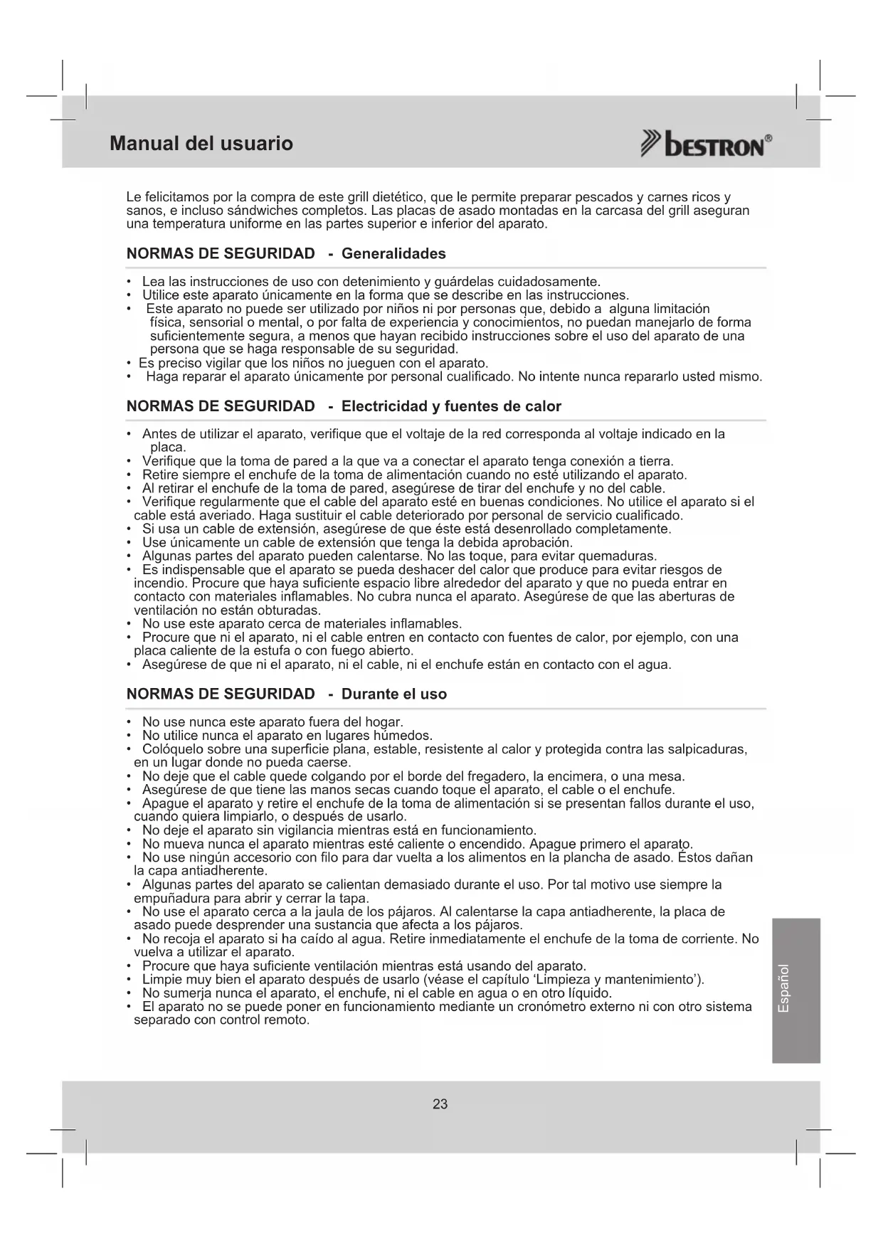 Español Le felicitamos por la compra de este grill dietético, que le permite preparar pescados y carnes ricos y sanos, e incluso sándwiches completos. Las placas de asado montadas en la carcasa del grill aseguran una temperatura uniforme en las partes superior e inferior del aparato. NORMAS DE SEGURIDAD - Generalidades
