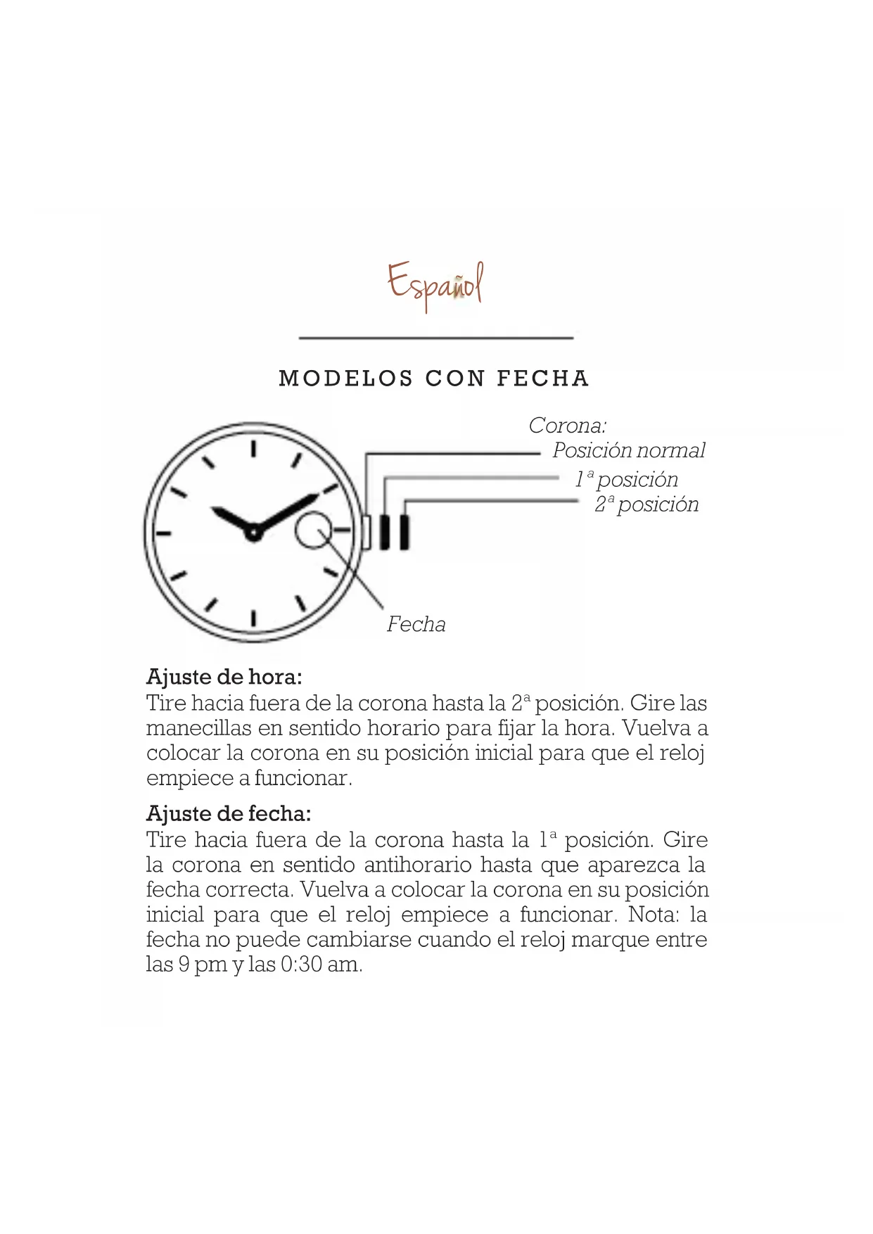 Posición normal 1ª posición 2ª posición Fecha Corona: Tire hacia fuera de la corona hasta la 2ª posición. Gire las manecillas en sentido horario para fijar la hora. Vuelva a colocar la corona en su posición inicial para que el reloj empiece a funcionar. Ajuste de hora: Tire hacia fuera de la corona hasta la 1ª posición. Gire la corona en sentido antihorario hasta que aparezca la fecha correcta. Vuelva a colocar la corona en su posición inicial para que el reloj empiece a funcionar. Nota: la fecha no puede cambiarse cuando el reloj marque entre las 9 pm y las 0:30 am. Ajuste de fecha:67 Posición normal 1ª posición 2ª posición