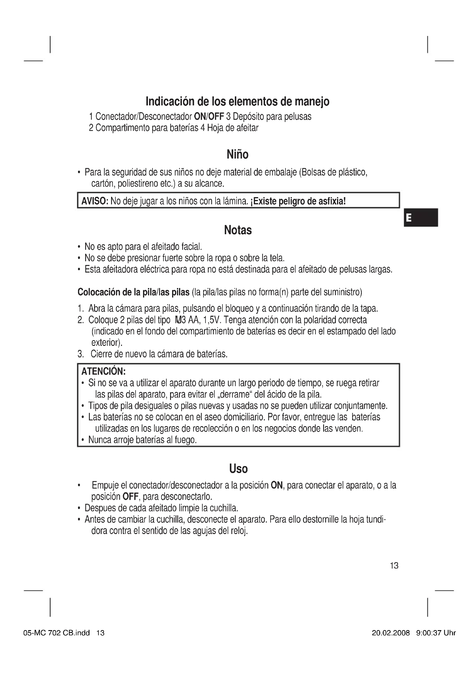 Indicación de los elementos de manejo 1 Conectador/Desconectador ON/OFF 3 Depósito para pelusas 2 Compartimento para baterías 4 Hoja de afeitar Niño