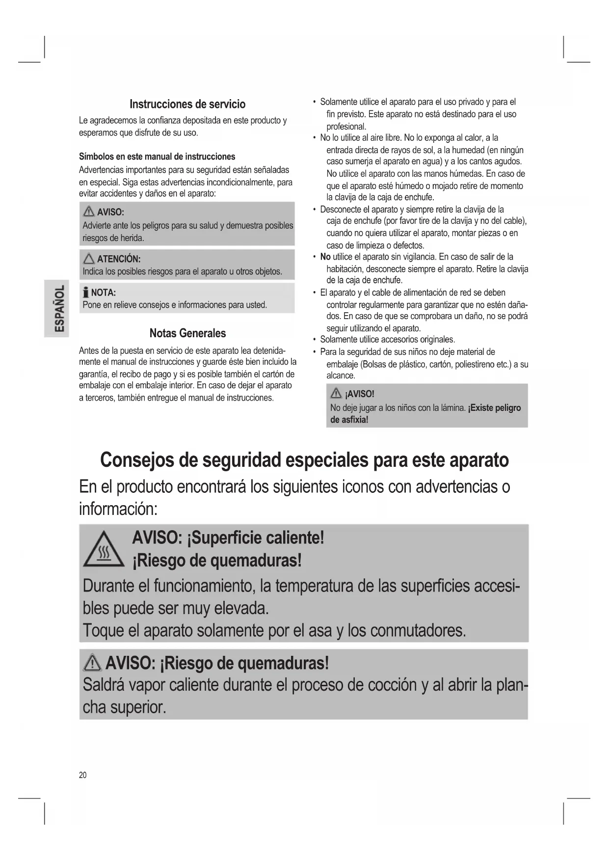 - Para la seguridad de sus niños no deje material de embalaje (Bolsas de plástico, cartón, poliestireno etc.) a su alcance. ¡AVISO! No deje jugar a los niños con la lámina. ¡Existe peligro de asxia! Instrucciones de servicio Le agradecemos la conanza depositada en este producto y esperamos que disfrute de su uso. Símbolos en este manual de instrucciones Advertencias importantes para su seguridad están señaladas en especial. Siga estas advertencias incondicionalmente, para evitar accidentes y daños en el aparato: AVISO: Advierte ante los peligros para su salud y demuestra posibles riesgos de herida. ATENCIÓN: Indica los posibles riesgos para el aparato u otros objetos. NOTA: Pone en relieve consejos e informaciones para usted. Notas Generales Antes de la puesta en servicio de este aparato lea detenida- mente el manual de instrucciones y guarde éste bien incluido la garantía, el recibo de pago y si es posible también el cartón de embalaje con el embalaje interior. En caso de dejar el aparato a terceros, también entregue el manual de instrucciones. Consejos de seguridad especiales para este aparato En el producto encontrará los siguientes iconos con advertencias o información: AVISO: ¡Supercie caliente! ¡Riesgo de quemaduras! Durante el funcionamiento, la temperatura de las supercies accesi- bles puede ser muy elevada. Toque el aparato solamente por el asa y los conmutadores. AVISO: ¡Riesgo de quemaduras! Saldrá vapor caliente durante el proceso de cocción y al abrir la plan- cha superior.21 ATENCIÓN: Peligro de incendio. El aceite y la grasa se pueden quemar si se calientan en exceso. Mantenga una distancia de seguridad suciente (30 cm) con respec- to a objetos inamables, tales como cortinas, mobiliario, etc. ATENCIÓN: El aparato no debe sumergirse en agua para limpiarlo. Por favor, consulte las instrucciones contenidas en el capítulo “Lim- pieza”.