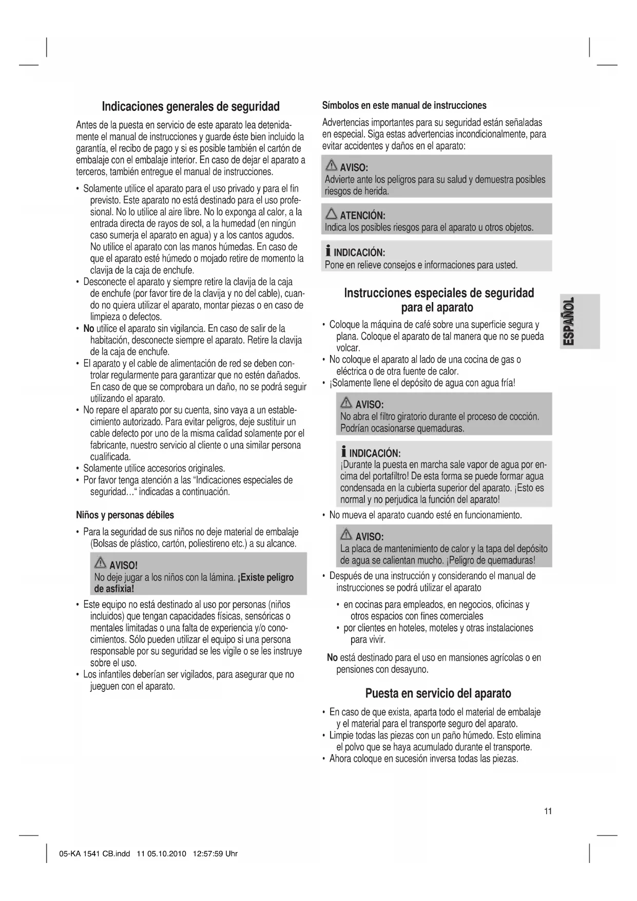Proteja nuestro medio ambiente, aparatos eléctricos no forman parte de la basura doméstica. Haga uso de los centros de recogida previstos para la elimi- nación de aparatos eléctricos y entregue allí sus aparatos eléctricos que no vaya a utilizar más. Ayudará en evitar las potenciales consecuencias, a causa de una erronéa eliminación de desechos, para el medio ambiente y la salud humana. Con ello, contribuirá a la recuperación, al reciclado y a otras formas de reutilización de los aparatos viejos eléctricos y electrónicos. La información cómo se debe eliminar los aparatos, se obtiene en su ayuntamiento o su administración municipal. 05-KA 1541 CB.indd 13 05.10.2010 12:57:59 Uhr14