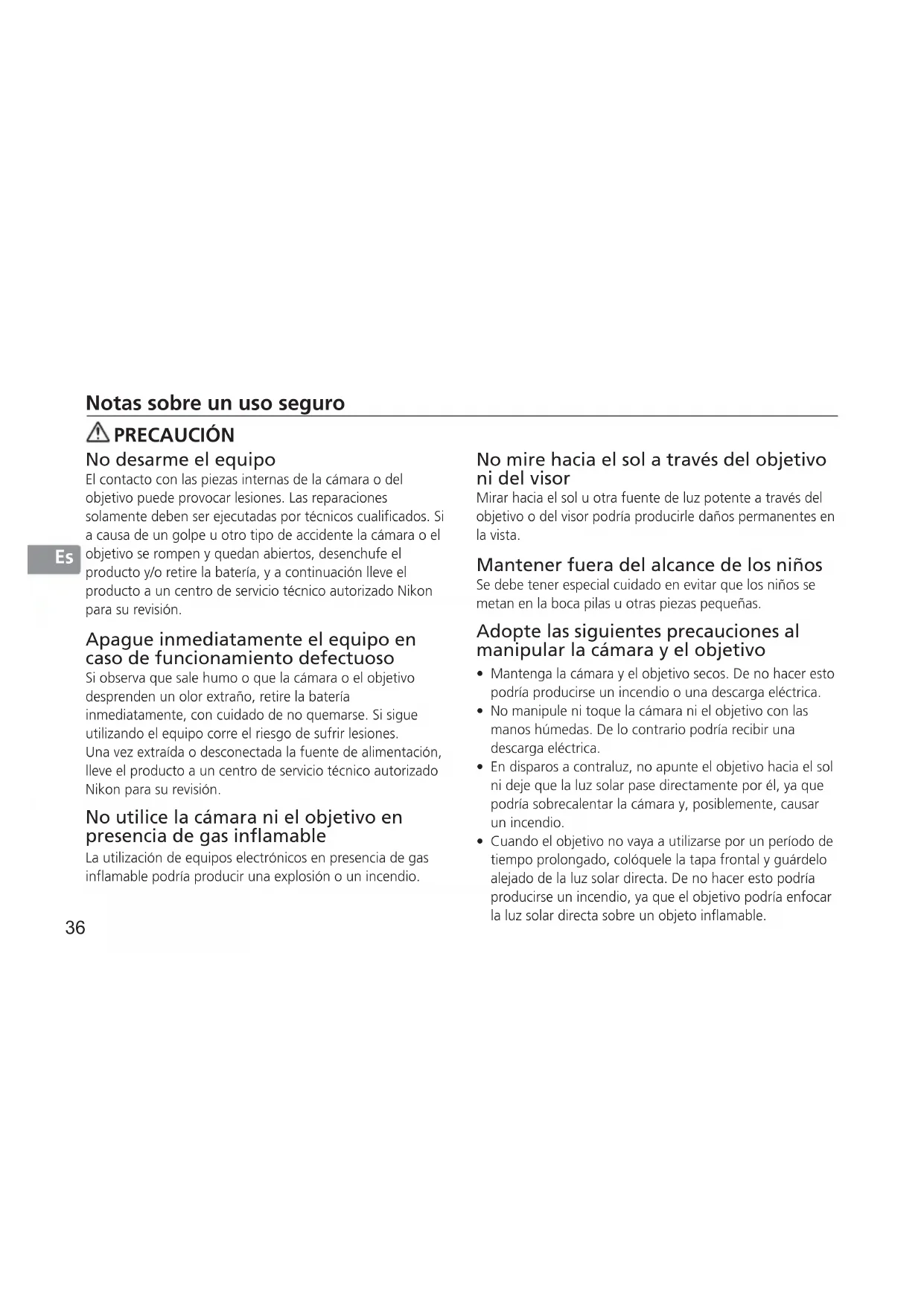 Notas sobre un uso seguro PRECAUCIÓN No desarme el equipo El contacto con las piezas internas de la cámara o del objetivo puede provocar lesiones. Las reparaciones solamente deben ser ejecutadas por técnicos cualificados. Si a causa de un golpe u otro tipo de accidente la cámara o el objetivo se rompen y quedan abiertos, desenchufe el producto y/o retire la batería, y a continuación lleve el producto a un centro de servicio técnico autorizado Nikon para su revisión. Apague inmediatamente el equipo en caso de funcionamiento defectuoso Si observa que sale humo o que la cámara o el objetivo desprenden un olor extraño, retire la batería inmediatamente, con cuidado de no quemarse. Si sigue utilizando el equipo corre el riesgo de sufrir lesiones. Una vez extraída o desconectada la fuente de alimentación, lleve el producto a un centro de servicio técnico autorizado Nikon para su revisión. No utilice la cámara ni el objetivo en presencia de gas inflamable La utilización de equipos electrónicos en presencia de gas inflamable podría producir una explosión o un incendio. No mire hacia el sol a través del objetivo ni del visor Mirar hacia el sol u otra fuente de luz potente a través del objetivo o del visor podría producirle daños permanentes en la vista. Mantener fuera del alcance de los niños Se debe tener especial cuidado en evitar que los niños se metan en la boca pilas u otras piezas pequeñas. Adopte las siguientes precauciones al manipular la cámara y el objetivo