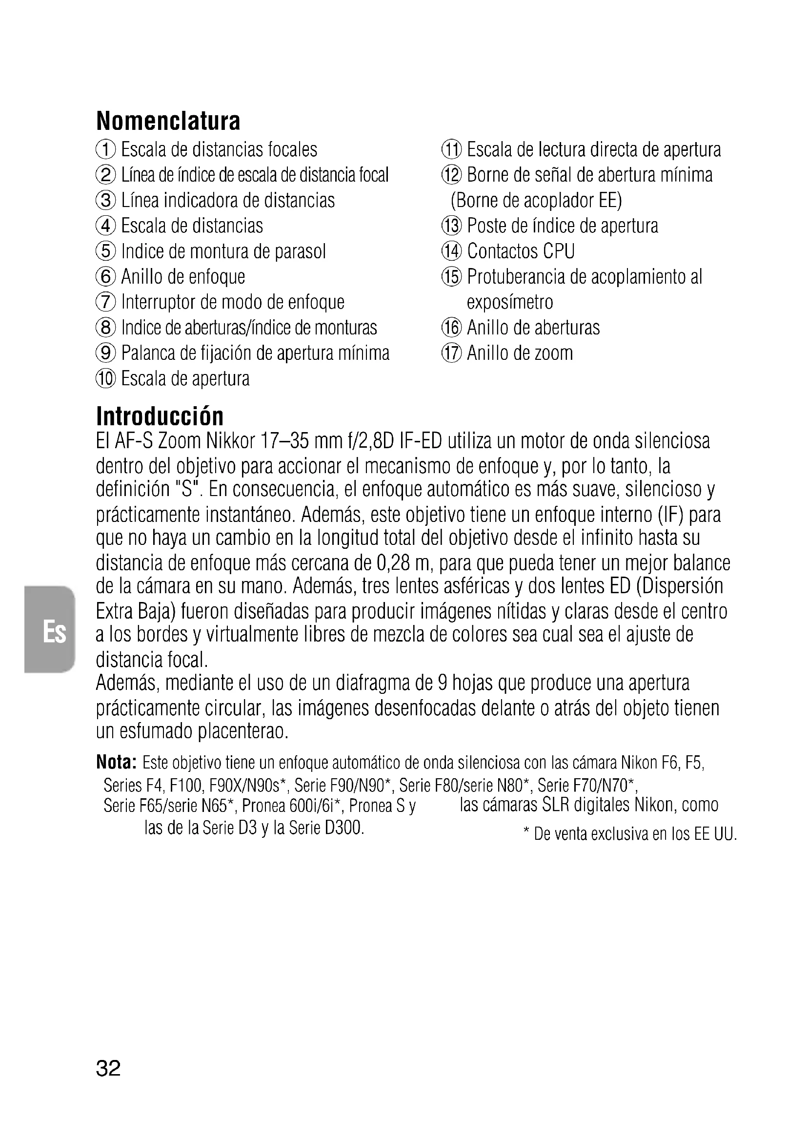 Anillo de zoom Introducción El AF-S Zoom Nikkor 17–35 mm f/2,8D IF-ED utiliza un motor de onda silenciosa dentro del objetivo para accionar el mecanismo de enfoque y, por lo tanto, la definición "S". En consecuencia, el enfoque automático es más suave, silencioso y prácticamente instantáneo. Además, este objetivo tiene un enfoque interno (IF) para que no haya un cambio en la longitud total del objetivo desde el infinito hasta su distancia de enfoque más cercana de 0,28 m, para que pueda tener un mejor balance de la cámara en su mano. Además, tres lentes asféricas y dos lentes ED (Dispersión Extra Baja) fueron diseñadas para producir imágenes nítidas y claras desde el centro a los bordes y virtualmente libres de mezcla de colores sea cual sea el ajuste de distancia focal. Además, mediante el uso de un diafragma de 9 hojas que produce una apertura prácticamente circular, las imágenes desenfocadas delante o atrás del objeto tienen un esfumado placenterao. Nota: Este objetivo tiene un enfoque automático de onda silenciosa con las cámara Nikon F6, F5, Series F4, F100, F90X/N90s*, Serie F90/N90*, Serie F80/serie N80*, Serie F70/N70*, Serie F65/serie N65*, Pronea 600i/6i*, Pronea S y las cámaras SLR digitales Nikon, como las de la Serie D3 y la Serie D300.* De venta exclusiva en los EE UU.33