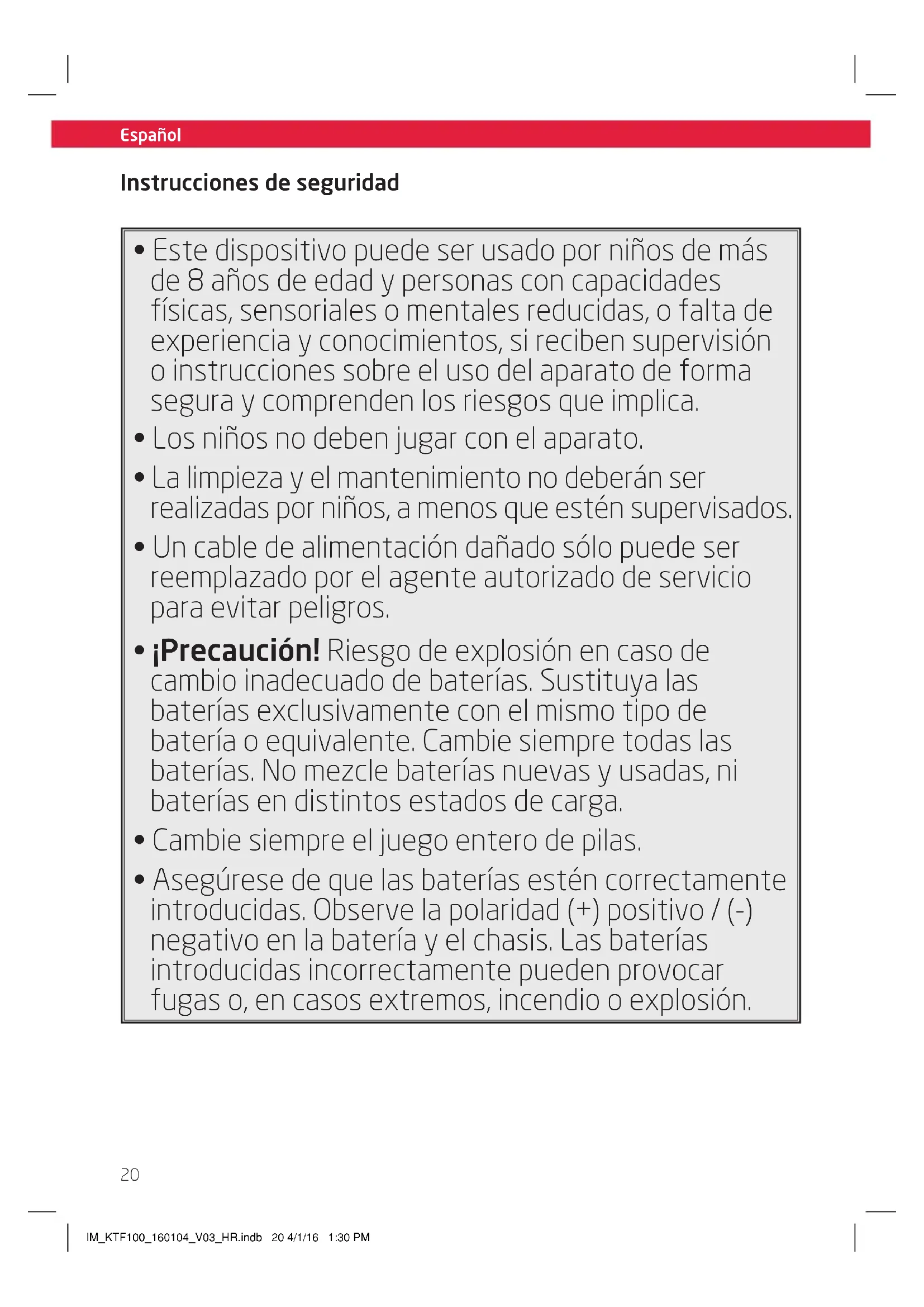 - Asegúrese de que las baterías estén correctamente introducidas. Observe la polaridad (+) positivo /(-) negativo en la batería y el chasis. Las baterías introducidas incorrectamente pueden provocar fugas o, en casos extremos, incendio o explosión. IM_KTF100_160104_V03_HR.indb 20 4/1/16 1:30 PMEspañol