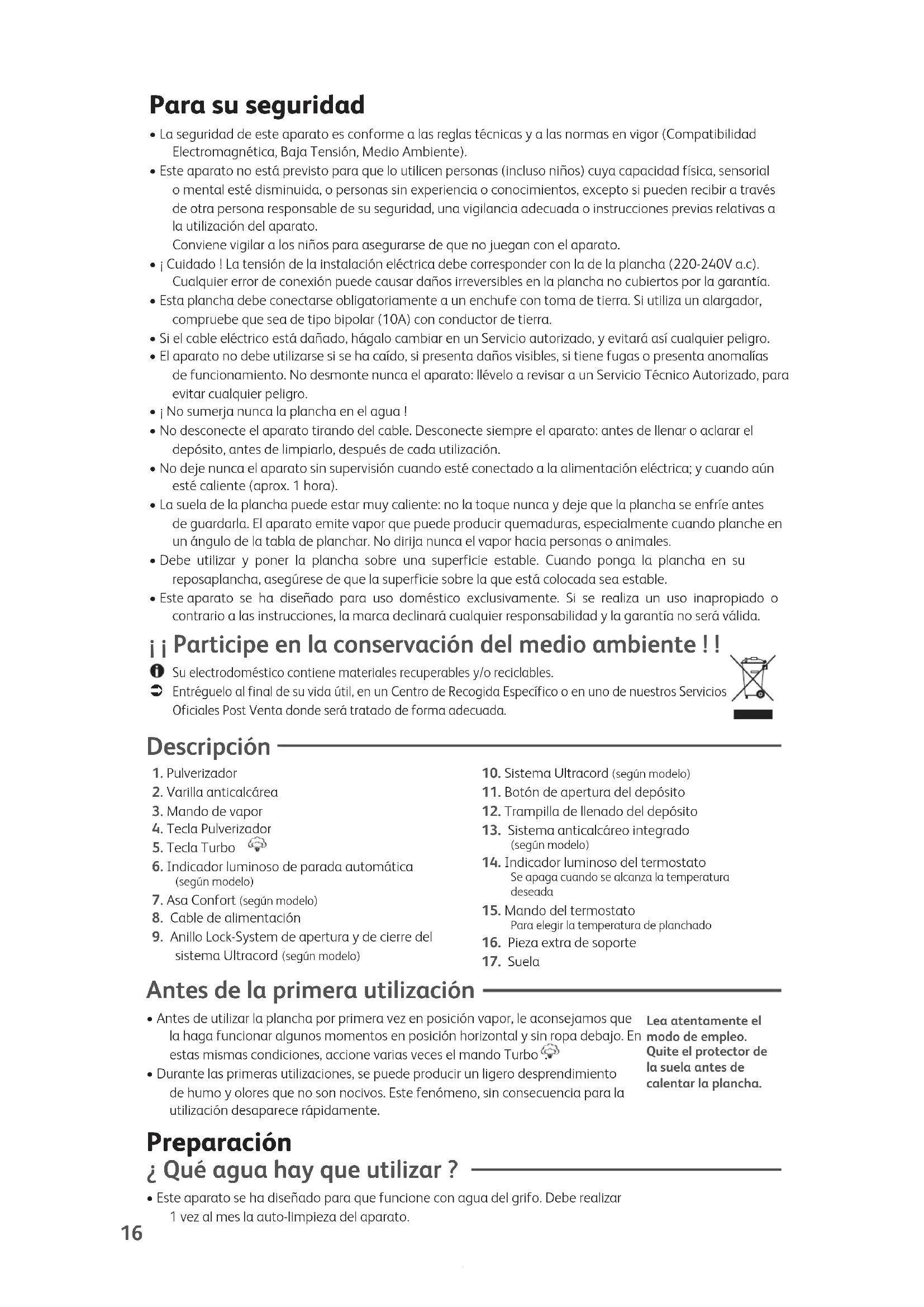 - Este aparato se ha diseñado para que funcione con agua del grifo. Debe realizar 1 vez al mes la auto-limpieza del aparato. Lea atentamente elmodo de empleo.Quite el protector dela suela antes decalentar la plancha.17