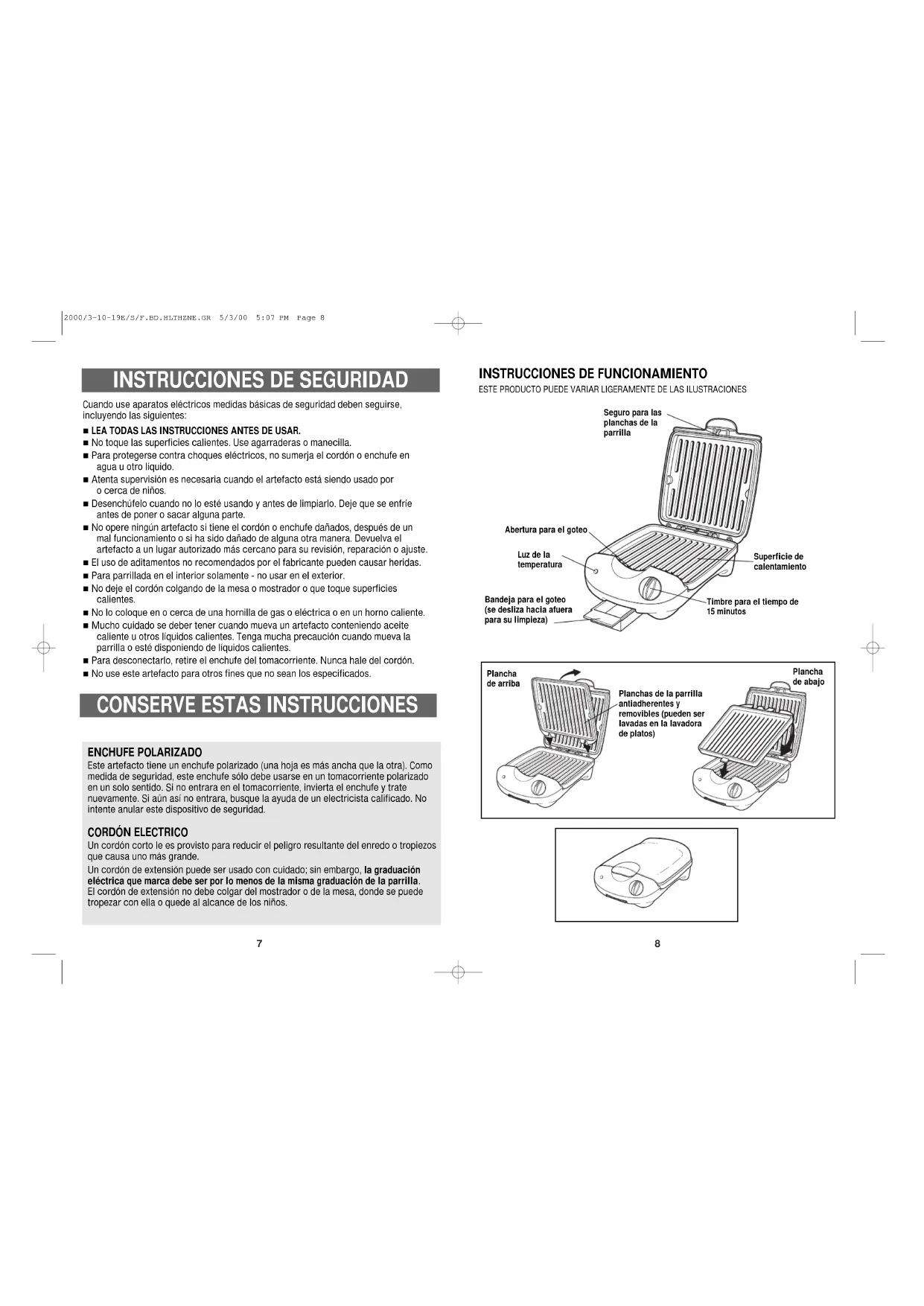 ESTE PRODUCTO PUEDE VARIAR LIGERAMENTE DE LAS ILUSTRACIONES Planchas de la parrilla antiadherentes y removibles (pueden ser lavadas en la lavadora de platos) Plancha de arriba Plancha de abajo 2000/3-10-19E/S/F.BD.HLTHZNE.GR 5/3/00 5:07 PM Page 810