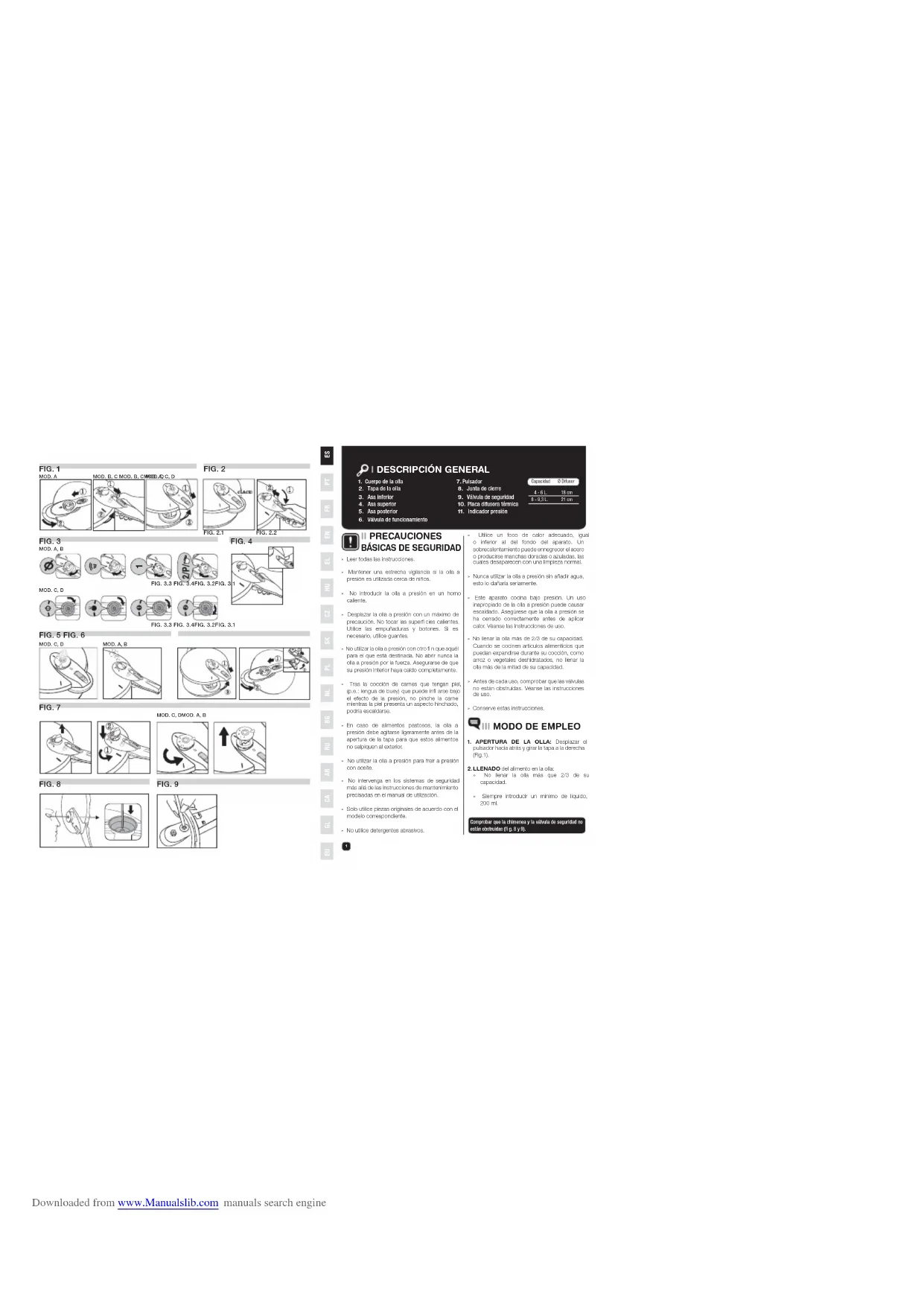 1. APERTURA DE LA OLLA: Desplazar el pulsador hacia atrás y girar la tapa a la derecha (Fig.1).2. LLENADO del alimento en la olla:» No llenar la olla más que 2/3 de su capacidad.» Siempre introducir un mínimo de líquido, 200 ml.Comprobar que la chimenea y la válvula de seguridad no están obstruidas (fi g. 8 y 9).» Leer todas las instrucciones.» Mantener una estrecha vigilancia si la olla a presión es utilizada cerca de niños.» No introducir la olla a presión en un horno caliente.» Desplazar la olla a presión con un máximo de precaución. No tocar las superfi cies calientes. Utilice las empuñaduras y botones. Si es necesario, utilice guantes.» No utilizar la olla a presión con otro fi n que aquél para el que está destinada. No abrir nunca la olla a presión por la fuerza. Asegurarse de que su presión interior haya caído completamente.» Tras la cocción de carnes que tengan piel, (p.e.: lengua de buey) que puede infl arse bajo el efecto de la presión, no pinche la carne mientras la piel presenta un aspecto hinchado, podría escaldarse.» En caso de alimentos pastosos, la olla a presión debe agitarse ligeramente antes de la apertura de la tapa para que estos alimentos no salpiquen al exterior.» No utilizar la olla a presión para freír a presión con aceite.» No intervenga en los sistemas de seguridad más allá de las instrucciones de mantenimiento precisadas en el manual de utilización.» Solo utilice piezas originales de acuerdo con el modelo correspondiente.» No utilice detergentes abrasivos. II PRECAUCIONES