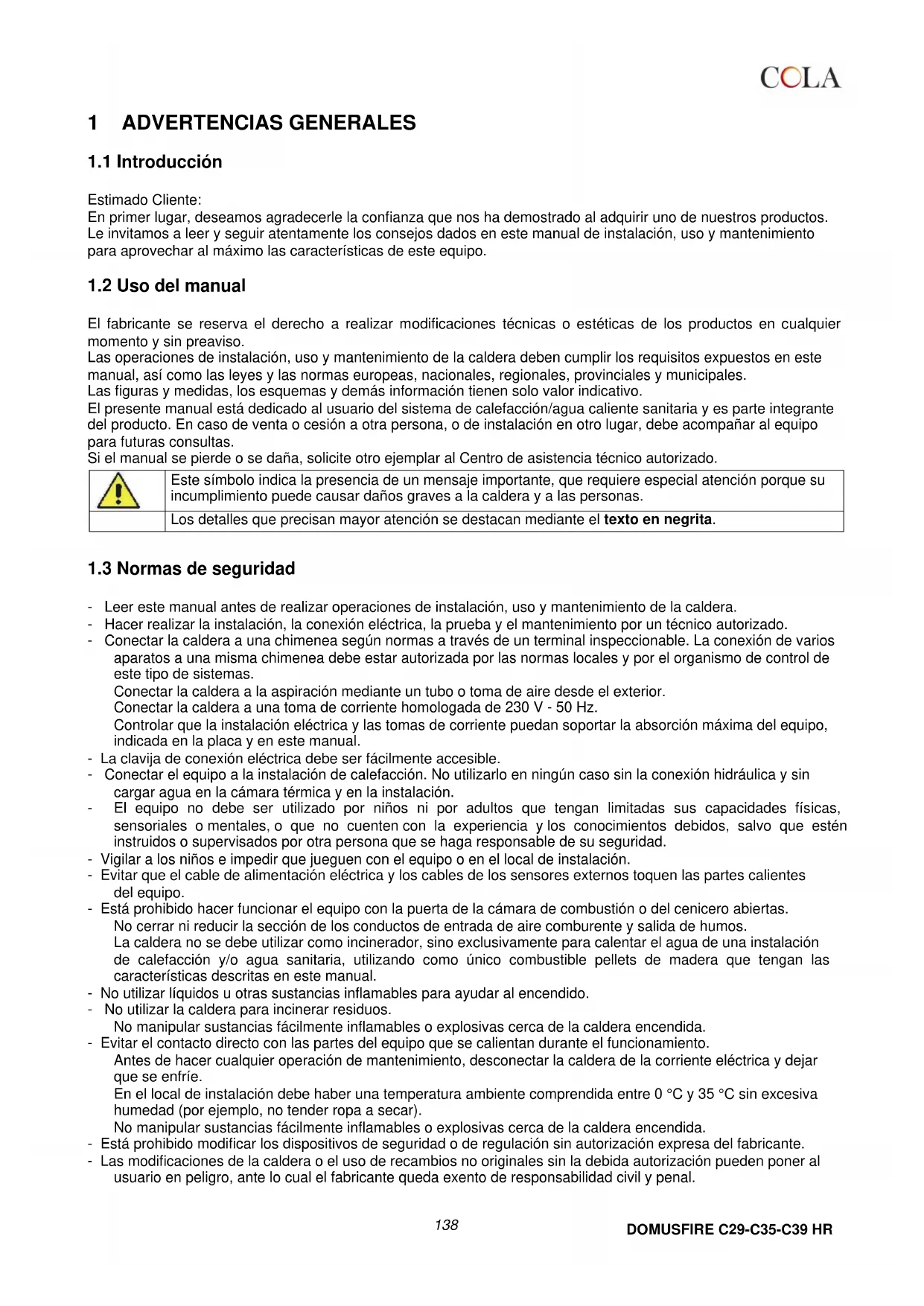 - Leer este manual antes de realizar operaciones de instalación, uso y mantenimiento de la caldera. - Hacer realizar la instalación, la conexión eléctrica, la prueba y el mantenimiento por un técnico autorizado. - Conectar la caldera a una chimenea según normas a través de un terminal inspeccionable. La conexión de varios aparatos a una misma chimenea debe estar autorizada por las normas locales y por el organismo de control de este tipo de sistemas. Conectar la caldera a la aspiración mediante un tubo o toma de aire desde el exterior. Conectar la caldera a una toma de corriente homologada de 230 V - 50 Hz. Controlar que la instalación eléctrica y las tomas de corriente puedan soportar la absorción máxima del equipo, indicada en la placa y en este manual. - La clavija de conexión eléctrica debe ser fácilmente accesible. - Conectar el equipo a la instalación de calefacción. No utilizarlo en ningún caso sin la conexión hidráulica y sin cargar agua en la cámara térmica y en la instalación. - El equipo no debe ser utilizado por niños ni por adultos que tengan limitadas sus capacidades físicas, sensoriales o mentales, o que no cuenten con la experiencia y los conocimientos debidos, salvo que estén instruidos o supervisados por otra persona que se haga responsable de su seguridad. - Vigilar a los niños e impedir que jueguen con el equipo o en el local de instalación. - Evitar que el cable de alimentación eléctrica y los cables de los sensores externos toquen las partes calientes del equipo. - Está prohibido hacer funcionar el equipo con la puerta de la cámara de combustión o del cenicero abiertas. No cerrar ni reducir la sección de los conductos de entrada de aire comburente y salida de humos. La caldera no se debe utilizar como incinerador, sino exclusivamente para calentar el agua de una instalación de calefacción y/o agua sanitaria, utilizando como único combustible pellets de madera que tengan las características descritas en este manual. - No utilizar líquidos u otras sustancias inflamables para ayudar al encendido. - No utilizar la caldera para incinerar residuos. No manipular sustancias fácilmente inflamables o explosivas cerca de la caldera encendida. - Evitar el contacto directo con las partes del equipo que se calientan durante el funcionamiento. Antes de hacer cualquier operación de mantenimiento, desconectar la caldera de la corriente eléctrica y dejar que se enfríe. En el local de instalación debe haber una temperatura ambiente comprendida entre 0 °C y 35 °C sin excesiva humedad (por ejemplo, no tender ropa a secar). No manipular sustancias fácilmente inflamables o explosivas cerca de la caldera encendida. - Está prohibido modificar los dispositivos de seguridad o de regulación sin autorización expresa del fabricante. - Las modificaciones de la caldera o el uso de recambios no originales sin la debida autorización pueden poner al usuario en peligro, ante lo cual el fabricante queda exento de responsabilidad civil y penal.DOMUSFIRE C29-C35-C39 HR