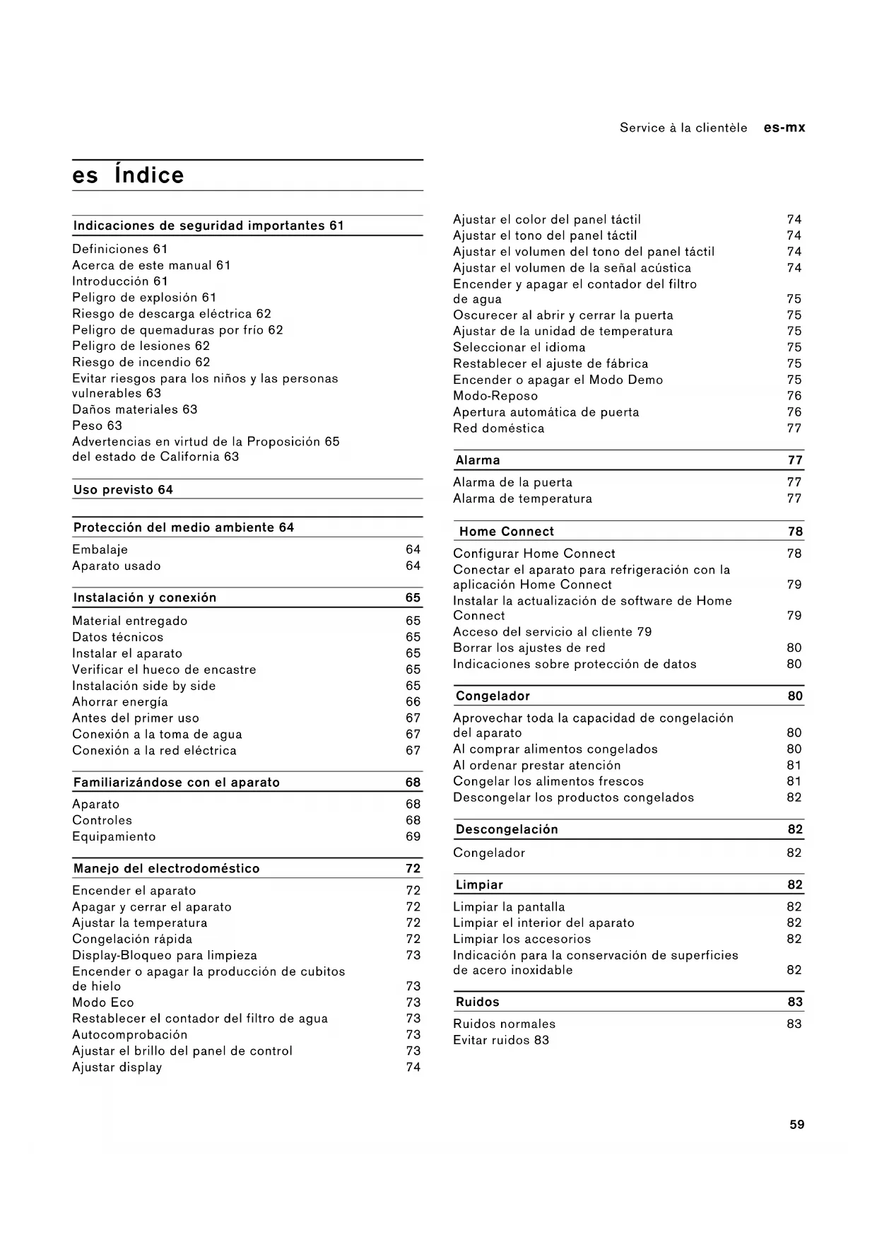 Riesgo de descarga eléctrica Una incorrecta instalación o reparación puede implicar serios peligros para el usuario. ▯ Al instalar el aparato, debe prestarse atención a que el cable de conexión a la red eléctrica no quede atrapado ni se dañe. ▯ Si el cable de conexión a la red eléctrica está dañado: desenchufe el aparato de la toma de corriente inmediatamente. ▯ No utilice nunca tomas de corriente múltiples ni cables de prolongación o adaptadores. ▯ Antes de realizar el mantenimiento o modificaciones en el electrodoméstico, desconectar el enchufe o apagar el fusible. Antes de limpiar el electrodoméstico, pulsar el interruptor principal para conexión/desconexión para apagarlo. Es posible cambiar de lugar las bandejas de cristal u otras piezas de equipamiento sin peligro mientras el aparato está conectado. ▯ Nunca corte o retire el tercer conductor (conductor a tierra) del cable de conexión a la red eléctrica. ▯ Nunca utilice ningún tipo de limpiador de vapor para derretir la escarcha o limpiar el aparato. El vapor puede llegar a las piezas eléctricas y causar un cortocircuito. ▯ El aparato, cables y accesorios solamente deben ser reparados o cambiados por el fabricante, por el personal de Servicio de Atención al Cliente o por una persona con una cualificación similar. ▯ Utilice únicamente piezas originales del fabricante. Peligro de quemaduras por frío ▯ Nunca introduzca los alimentos congelados - inmediatamente después de sacarlos del congelador - directamente en la boca. ▯ Evite el contacto prolongado de la piel con los alimentos congelados, el hielo o los tubos del congelador. Peligro de lesiones Los envases con bebidas carbonatadas pueden estallar. No almacene envases con bebidas carbonatadas en el congelador. Riesgo de incendio Las tomas de corriente múltiples portátiles o las fuentes de alimentación portátiles pueden sobrecalentarse y provocar incendios. No colocar tomas de corriente múltiples portátiles ni fuentes de alimentación portátiles detrás del aparato.63 9 Indicaciones de seguridad importantes ¡LEER Y CONSERVAR ESTAS INDICACIONES! Evitar riesgos para los niños y las personas vulnerables En situación de riesgo se encuentran: ▯ niños,▯ personas con sus facultades físicas, sensoriales o perceptivas mermadas, ▯ personas que carecen de los conocimientos necesarios relativos al manejo seguro del aparato. Medidas: ▯ Nunca deje que los niños jueguen con el aparato. ▯ Asegurarse de que los niños y las personas vulnerables han entendido los peligros. ▯ Supervisar los niños durante las tareas de limpieza y mantenimiento. Peligro de asfixia ▯ En caso de disponer la unidad de una cerradura, guardar la llave fuera del alcance de los niños. ▯ No dejar el embalaje o sus partes a los niños. Daños materiales Para evitar daños materiales: ▯ No pise, ni se apoye sobre el zócalo, cajones o puertas. ▯ Mantenga las piezas de plástico y juntas de goma limpias de aceites y grasas. ▯ Tirar del enchufe - no del cable de conexión. Peso El aparato es muy pesado. Realizar la instalación y el transporte del aparato siempre con un mínimo de 2 personas. ~ "Instalar el aparato" en la página 65 Advertencias en virtud de la Proposición 65 del estado de California Este producto puede contener un químico que el Estado de California reconoce como potencialmente cancerígeno o causante de daños reproductivos. Por tanto, su producto debe llevar en su embalaje la siguiente etiqueta de conformidad con la legislación de California:64 es-mx Uso previsto