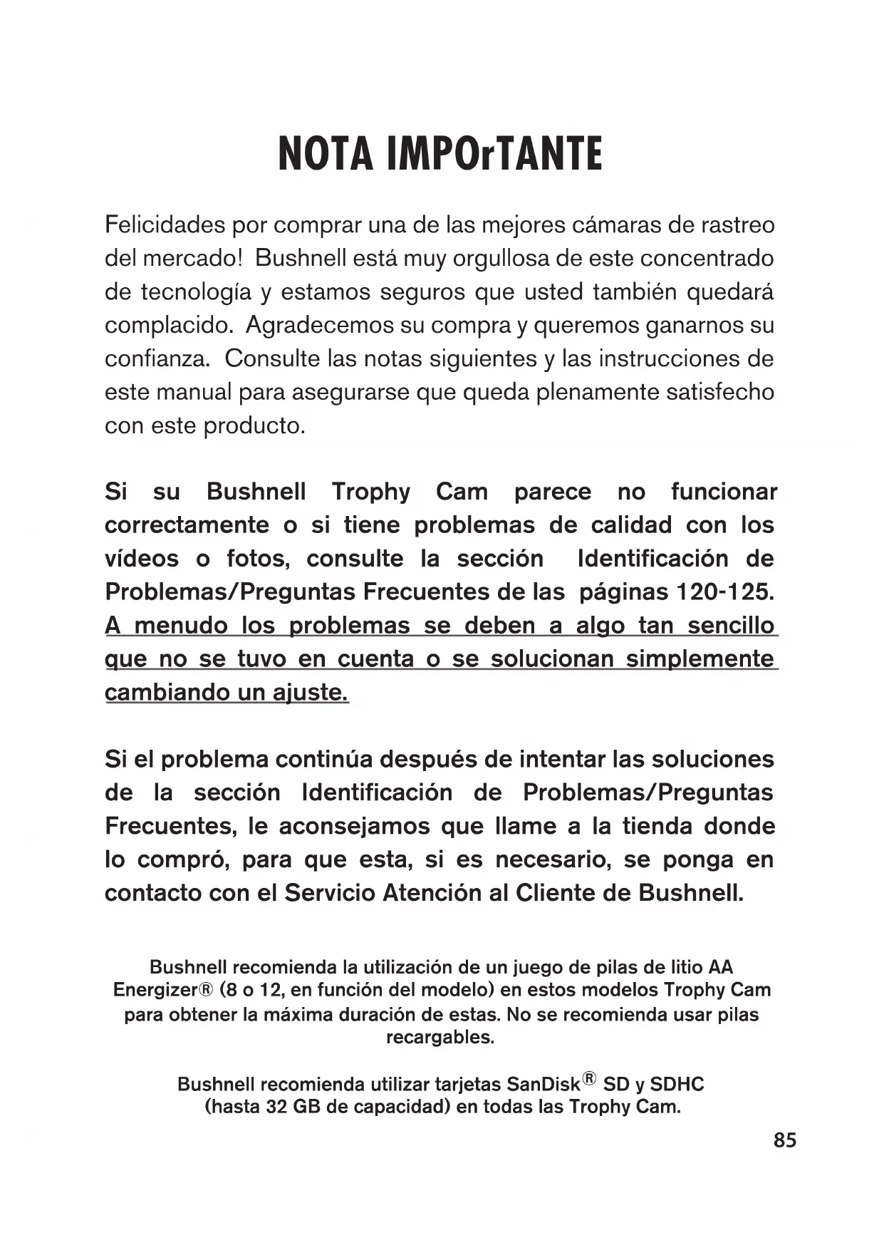 www.trophycam.es85 NOTA IMPOrTANTE Felicidades por comprar una de las mejores cámaras de rastreo del mercado! Bushnell está muy orgullosa de este concentrado de tecnología y estamos seguros que usted también quedará complacido. Agradecemos su compra y queremos ganarnos su confianza. Consulte las notas siguientes y las instrucciones de este manual para asegurarse que queda plenamente satisfecho con este producto. Si su Bushnell Trophy Cam parece no funcionar correctamente o si tiene problemas de calidad con los vídeos o fotos, consulte la sección Identificación de Problemas/Preguntas Frecuentes de las páginas 120-125. A menudo los problemas se deben a algo tan sencillo que no se tuvo en cuenta o se solucionan simplemente cambiando un ajuste. Si el problema continúa después de intentar las soluciones de la sección Identificación de Problemas/Preguntas Frecuentes, le aconsejamos que llame a la tienda donde lo compró, para que esta, si es necesario, se ponga en contacto con el Servicio Atención al Cliente de Bushnell. Bushnell recomienda la utilización de un juego de pilas de litio AA Energizer® (8 o 12, en función del modelo) en estos modelos Trophy Cam para obtener la máxima duración de estas. No se recomienda usar pilas recargables. Bushnell recomienda utilizar tarjetas SanDisk