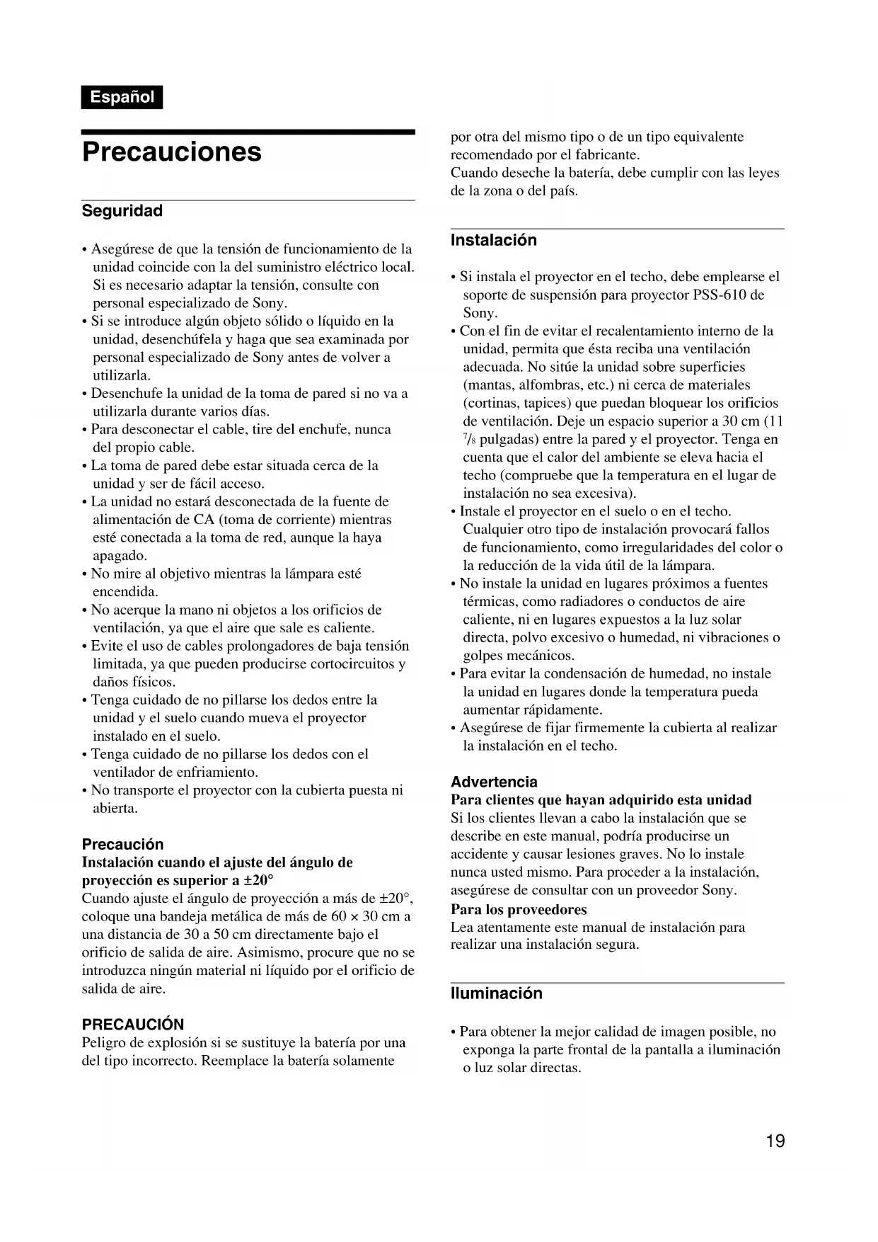 - No transporte el proyector con la cubierta puesta ni abierta. Precaución Instalación cuando el ajuste del ángulo de proyección es superior a ±20° Cuando ajuste el ángulo de proyección a más de ±20°, coloque una bandeja metálica de más de 60 × 30 cm a una distancia de 30 a 50 cm directamente bajo el orificio de salida de aire. Asimismo, procure que no se introduzca ningún material ni líquido por el orificio de salida de aire. PRECAUCIÓN Peligro de explosión si se sustituye la batería por una del tipo incorrecto. Reemplace la batería solamente por otra del mismo tipo o de un tipo equivalente recomendado por el fabricante. Cuando deseche la batería, debe cumplir con las leyes de la zona o del país. Instalación