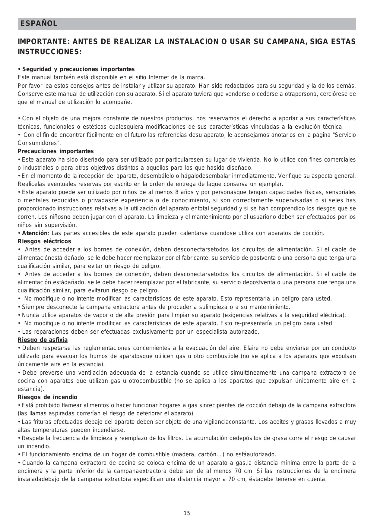 No modifie o no intente modifier las caracterticas de este aparato. Este representaria un peligro para usted. - Siempre desconecte la campana extractora antes de proceder a sulimpieza o a su mantenimiento.
