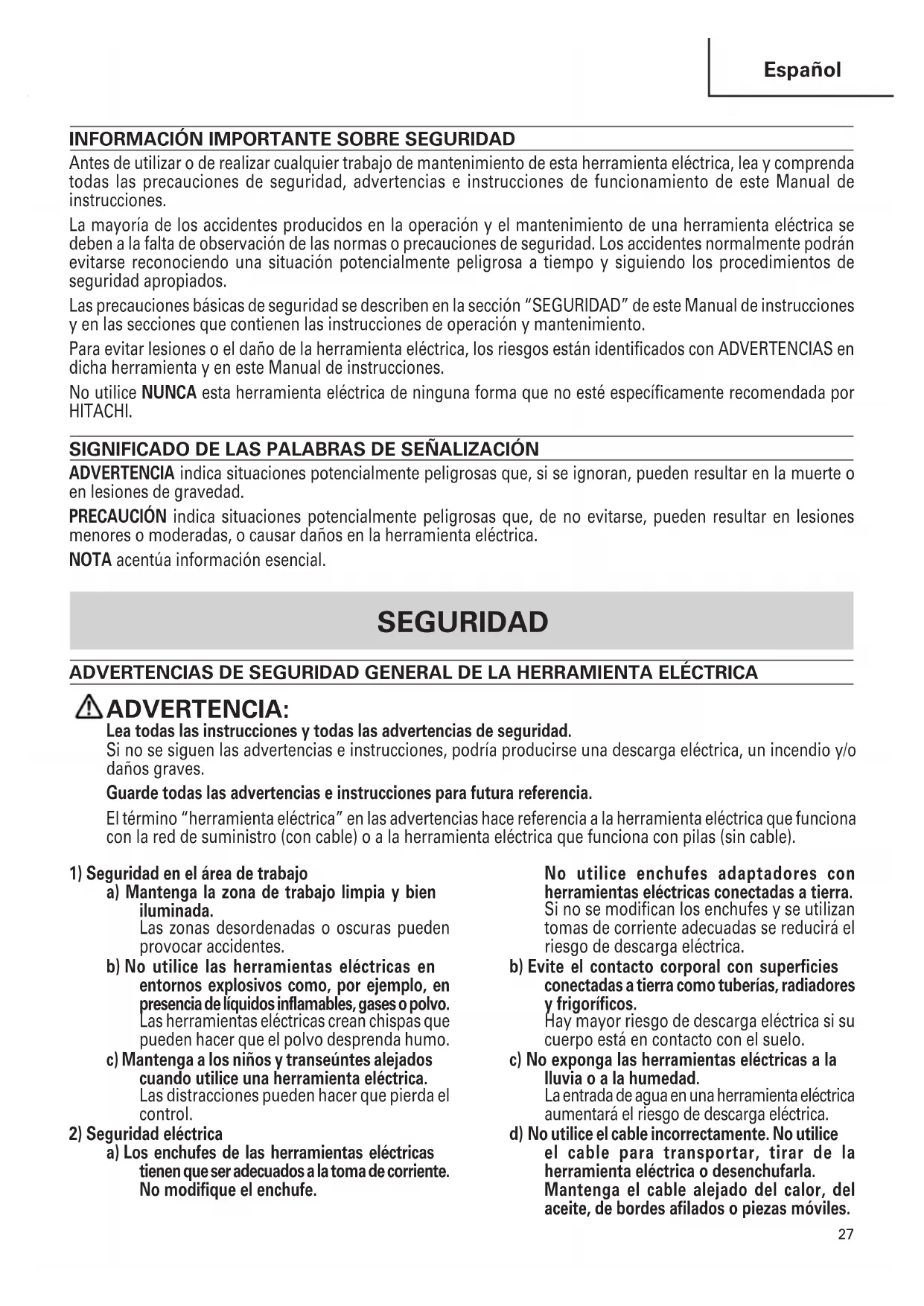 Antes de utilizar o de realizar cualquier trabajo de mantenimiento de esta herramienta eléctrica, lea y comprenda todas las precauciones de seguridad, advertencias e instrucciones de funcionamiento de este Manual de instrucciones. La mayoría de los accidentes producidos en la operación y el mantenimiento de una herramienta eléctrica se deben a la falta de observación de las normas o precauciones de seguridad. Los accidentes normalmente podrán evitarse reconociendo una situación potencialmente peligrosa a tiempo y siguiendo los procedimientos de seguridad apropiados. Las precauciones básicas de seguridad se describen en la sección “SEGURIDAD” de este Manual de instrucciones y en las secciones que contienen las instrucciones de operación y mantenimiento. Para evitar lesiones o el daño de la herramienta eléctrica, los riesgos están identificados con ADVERTENCIAS en dicha herramienta y en este Manual de instrucciones. No utilice NUNCA esta herramienta eléctrica de ninguna forma que no esté específicamente recomendada por HITACHI. SIGNIFICADO DE LAS PALABRAS DE SEÑALIZACIÓN ADVERTENCIA indica situaciones potencialmente peligrosas que, si se ignoran, pueden resultar en la muerte o en lesiones de gravedad. PRECAUCIÓN indica situaciones potencialmente peligrosas que, de no evitarse, pueden resultar en lesiones menores o moderadas, o causar daños en la herramienta eléctrica. NOTA acentúa información esencial. SEGURIDAD ADVERTENCIAS DE SEGURIDAD GENERAL DE LA HERRAMIENTA ELÉCTRICA ADVERTENCIA: Lea todas las instrucciones y todas las advertencias de seguridad. Si no se siguen las advertencias e instrucciones, podría producirse una descarga eléctrica, un incendio y/o daños graves. Guarde todas las advertencias e instrucciones para futura referencia. El término “herramienta eléctrica” en las advertencias hace referencia a la herramienta eléctrica que funciona con la red de suministro (con cable) o a la herramienta eléctrica que funciona con pilas (sin cable).