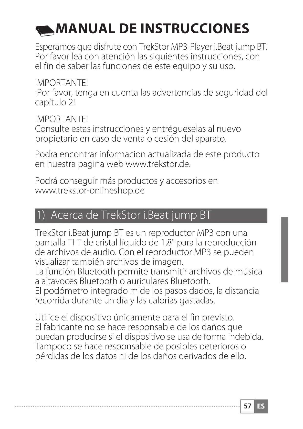 Esperamos que disfrute con TrekStor MP3-Player i.Beat jump BT. Por favor lea con atención las siguientes instrucciones, con el fin de saber las funciones de este equipo y su uso. IMPORTANTE! ¡Por favor, tenga en cuenta las advertencias de seguridad del capítulo 2! IMPORTANTE! Consulte estas instrucciones y entrégueselas al nuevo propietario en caso de venta o cesión del aparato. Podra encontrar informacion actualizada de este producto en nuestra pagina web www.trekstor.de. Podrá conseguir más productos y accesorios en www.trekstor-onlineshop.de