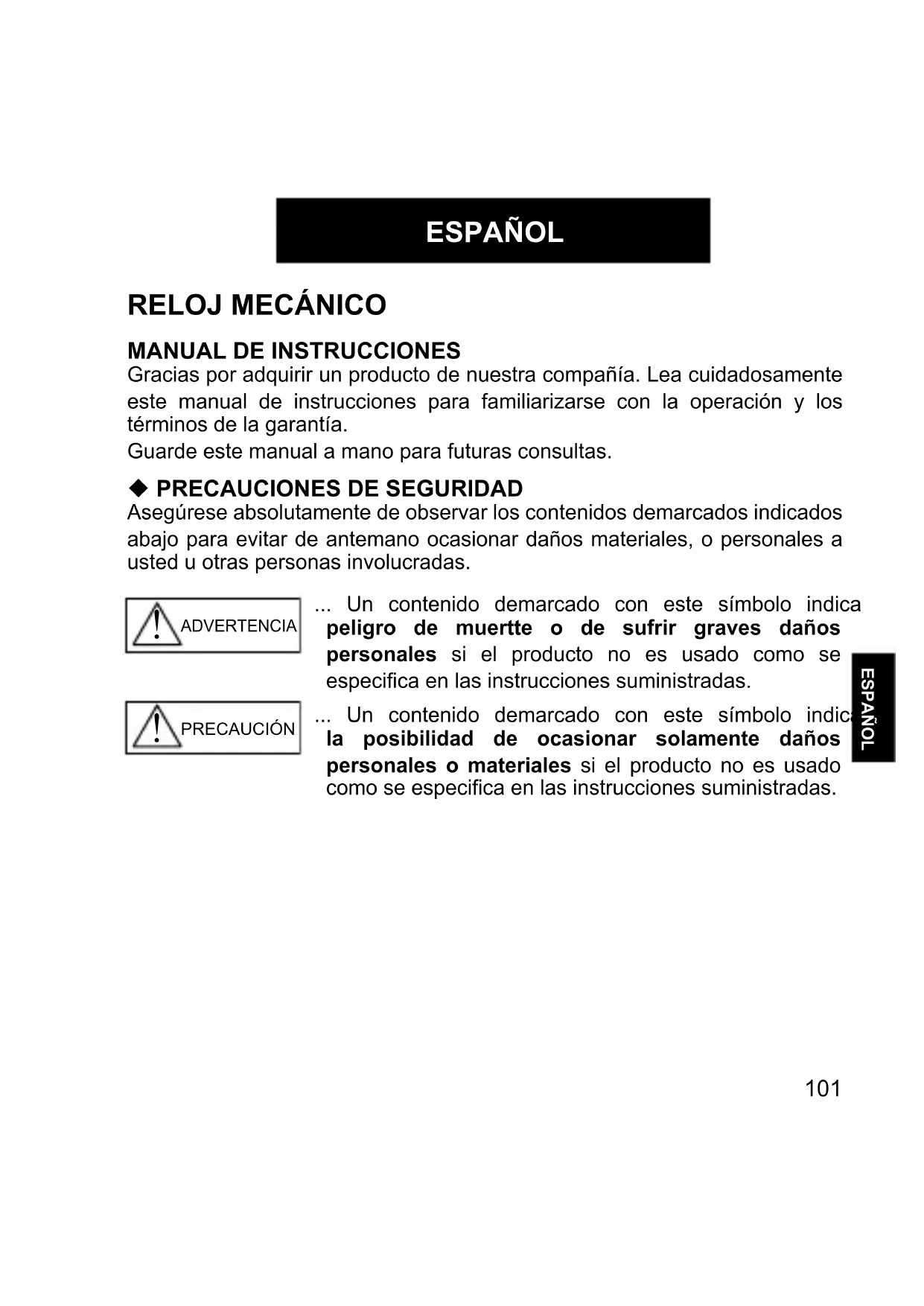 PRECAUCIÓN 4 Mantenga siempre la corona hacia adentro (en la posición normal) mientras lleva puesto el reloj. Si la corona es del tipo de bloqueo por rosca, compruebe que esté firmemente enroscada. 5 No opere la corona bajo el agua o cuando el reloj esté mojado. El agua podría entrar en el interior del reloj y dañar la resistencia al agua. 6 Si su reloj no es resistente al agua, cuídese de las salpicaduras de agua (durante el lavado de cara, lluvia, etc.) y del sudor. Si el reloj llegara a mojarse con agua o sudor, séquelo con un paño suave y seco. 7 Incluso con un reloj resistente al agua para el uso diario, evite poner el reloj debajo de un chorro fuerte de agua. Podría aplicarse una presión de agua por encima del límite, y dañar la resistencia al agua. 8 Con un reloj resistente al agua para el uso diario, limpie la caja si ha estado expuesto al agua del mar, y a continuación séquelo por completo para evitar la oxidación y otros efectos perjudiciales. 9 El interior del reloj contiene una cierta cantidad de humedad, la cual podría causar el empañamiento sobre el lado interior del cristal cuando la temperatura del aire exterior esté por debajo de la temperatura interna del reloj. Si el empañamiento es temporal, no causará ningún daño en el interior del reloj, pero si es prolongado, o si penetrara agua en el reloj, no deje este problema sin tratar, póngase en contacto con el vendedor.104 ESPAÑOL (2) Golpes 1 Asegúrese de quitarse el reloj cuando participe en deportes extenuantes, aunque el uso del reloj para un deporte ligero como el golf, etc., no tendrá efectos perjudiciales. 2 Evite los impactos fuertes, como dejarlo caer al suelo. (3) Magnetismo 1 Si deja el reloj en un lugar cerca de un campo magnético fuerte durante largo tiempo, los componentes del mismo podrán magnetizarse y ocasionar una avería. Tenga cuidado.
