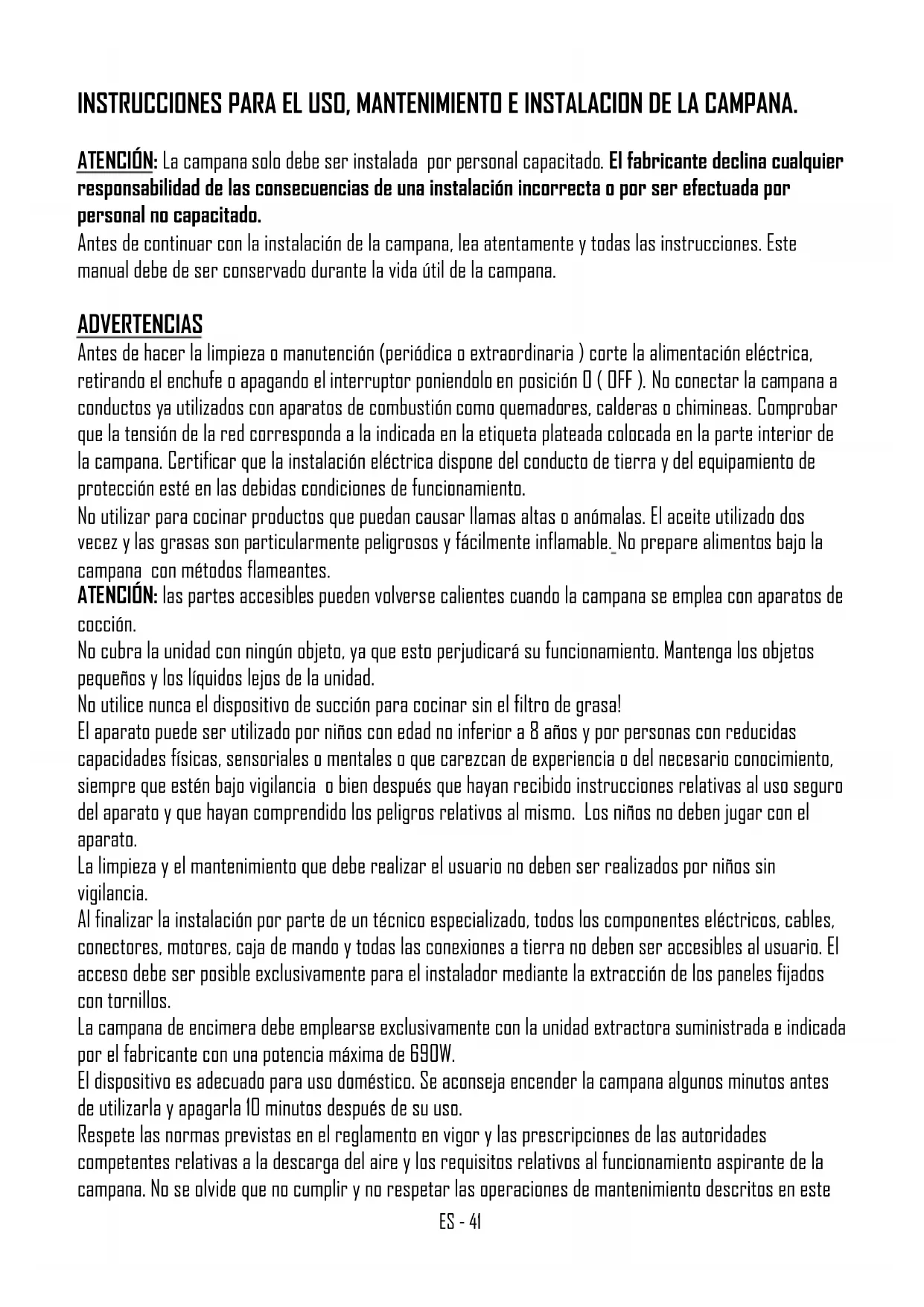 Vóór het uitvoeren van enige schoonmaak- of onderhoudsbeurt de stroomvoeding naar de afzuigkap uitschakelen door de algemene schakelaar op de stand 0 (OFF) te zetten.NL - 40 Reiniging van de metalen filters De metalen filters die met de afzuigkap worden bijgeleverd moeten elke maand worden gereinigd afhankelijk van het meer of minder gebruik, met warm water en een niet aantastend vloeibaar wasmiddel. De metalen filters haalt men er uit met het betreffende handvat. Na het afwassen moeten de filters goed afgedroogd worden en op korrekte wijze weer op hun plaats gebracht worden. Koolfilters OPTIONEEL (KFCP en KFCPC) Indien de afzuigkap wordt gebruikt als recirculatiekap heeft men koolstoffilters nodig (KFCP en KFCPC). De actieve koolstof van de filters absorbeert de keukenluchtjes. Reiniging van de afzuigkap Indien u de oppervlakken regelmatig reinigt, moet u later niet met veel moeite hardnekkige vlekken verwijderen. Als de afzuigkap gevernist of van koper is, met een zachte doek met lauw water en een neutraal afwasmiddel reinigen. Geen vloeistof direkt op de afzuigkap gieten of korrelige en/of schuurmiddelen gebruiken. Geen aantastende middelen gebruiken en ook geen chemische oplosmiddelen of derivaten van uit petroleum gedistilleerde middelen, daar deze olieachtige resten kunnen achterlaten, die oxidatie en polymerisatie kunnen veroorzaken. De fabriek is niet verantwoordelijk voor esthetische schade als gevolg van het niet nakomen van bovengenoemde aanwijzigingen. Es. KFCPC KFCP KFCPES - 41 INSTRUCCIONES PARA EL USO, MANTENIMIENTO E INSTALACION DE LA CAMPANA. ATENCIÓN: La campana solo debe ser instalada por personal capacitado. El fabricante declina cualquier responsabilidad de las consecuencias de una instalación incorrecta o por ser efectuada por personal no capacitado. Antes de continuar con la instalación de la campana, lea atentamente y todas las instrucciones. Este manual debe de ser conservado durante la vida útil de la campana. ADVERTENCIAS Antes de hacer la limpieza o manutención (periódica o extraordinaria ) corte la alimentación eléctrica, retirando el enchufe o apagando el interruptor poniendolo en posición 0 ( OFF ). No conectar la campana a conductos ya utilizados con aparatos de combustión como quemadores, calderas o chimineas. Comprobar que la tensión de la red corresponda a la indicada en la etiqueta plateada colocada en la parte interior de la campana. Certificar que la instalación eléctrica dispone del conducto de tierra y del equipamiento de protección esté en las debidas condiciones de funcionamiento. No utilizar para cocinar productos que puedan causar llamas altas o anómalas. El aceite utilizado dos vecez y las grasas son particularmente peligrosos y fácilmente inflamable. No prepare alimentos bajo la campana con métodos flameantes. ATENCIÓN: las partes accesibles pueden volverse calientes cuando la campana se emplea con aparatos de cocción. No cubra la unidad con ningún objeto, ya que esto perjudicará su funcionamiento. Mantenga los objetos pequeños y los líquidos lejos de la unidad. No utilice nunca el dispositivo de succión para cocinar sin el filtro de grasa! El aparato puede ser utilizado por niños con edad no inferior a 8 años y por personas con reducidas capacidades físicas, sensoriales o mentales o que carezcan de experiencia o del necesario conocimiento, siempre que estén bajo vigilancia o bien después que hayan recibido instrucciones relativas al uso seguro del aparato y que hayan comprendido los peligros relativos al mismo. Los niños no deben jugar con el aparato. La limpieza y el mantenimiento que debe realizar el usuario no deben ser realizados por niños sin vigilancia. Al finalizar la instalación por parte de un técnico especializado, todos los componentes eléctricos, cables, conectores, motores, caja de mando y todas las conexiones a tierra no deben ser accesibles al usuario. El acceso debe ser posible exclusivamente para el instalador mediante la extracción de los paneles fijados con tornillos. La campana de encimera debe emplearse exclusivamente con la unidad extractora suministrada e indicada por el fabricante con una potencia máxima de 690W. El dispositivo es adecuado para uso doméstico. Se aconseja encender la campana algunos minutos antes de utilizarla y apagarla 10 minutos después de su uso. Respete las normas previstas en el reglamento en vigor y las prescripciones de las autoridades competentes relativas a la descarga del aire y los requisitos relativos al funcionamiento aspirante de la campana. No se olvide que no cumplir y no respetar las operaciones de mantenimiento descritos en esteES - 42 manual puede producir un riesgo de incendio. Los textos, imágenes y datos técnicos corresponden al estado de la unidad en el momento de la impresión. Está sujeto a cambios de acuerdo con el desarrollo del producto. INSTALACIÓN La campana debe ser combinado con placas dominos (inducción o vitrocerámicas). No se permite y queda expresamente prohibido el uso con placas de cocción de gas. Al finalizar la instalación por parte de un técnico especializado, todos los componentes eléctricos, cables, conectores, motores, caja de mando y todas las conexiones a tierra no deben ser accesibles al usuario. El acceso debe ser posible exclusivamente para el instalador mediante la extracción de los paneles fijados con tornillos. La campana permite dos modos de funcionamiento: filtrante y aspirante. En el modo filtrante, o sea con reciclaje de aire es necesario montar los filtros de carbón ( ver el párrafo sobre los FILTROS DE CARBÓN ). En el modo aspirante o sea el aire es expulso hacia el exterior, es necesario la instalación de un conducto de gases propio y de un sistema de compensación adecuado y dimensionado de acuerdo con las normas en vigor. El tubo de expulsión de gases debe tener el área de sección igual o superior a la salida de la campana. El local donde està instalada la campana, debe disponer de 