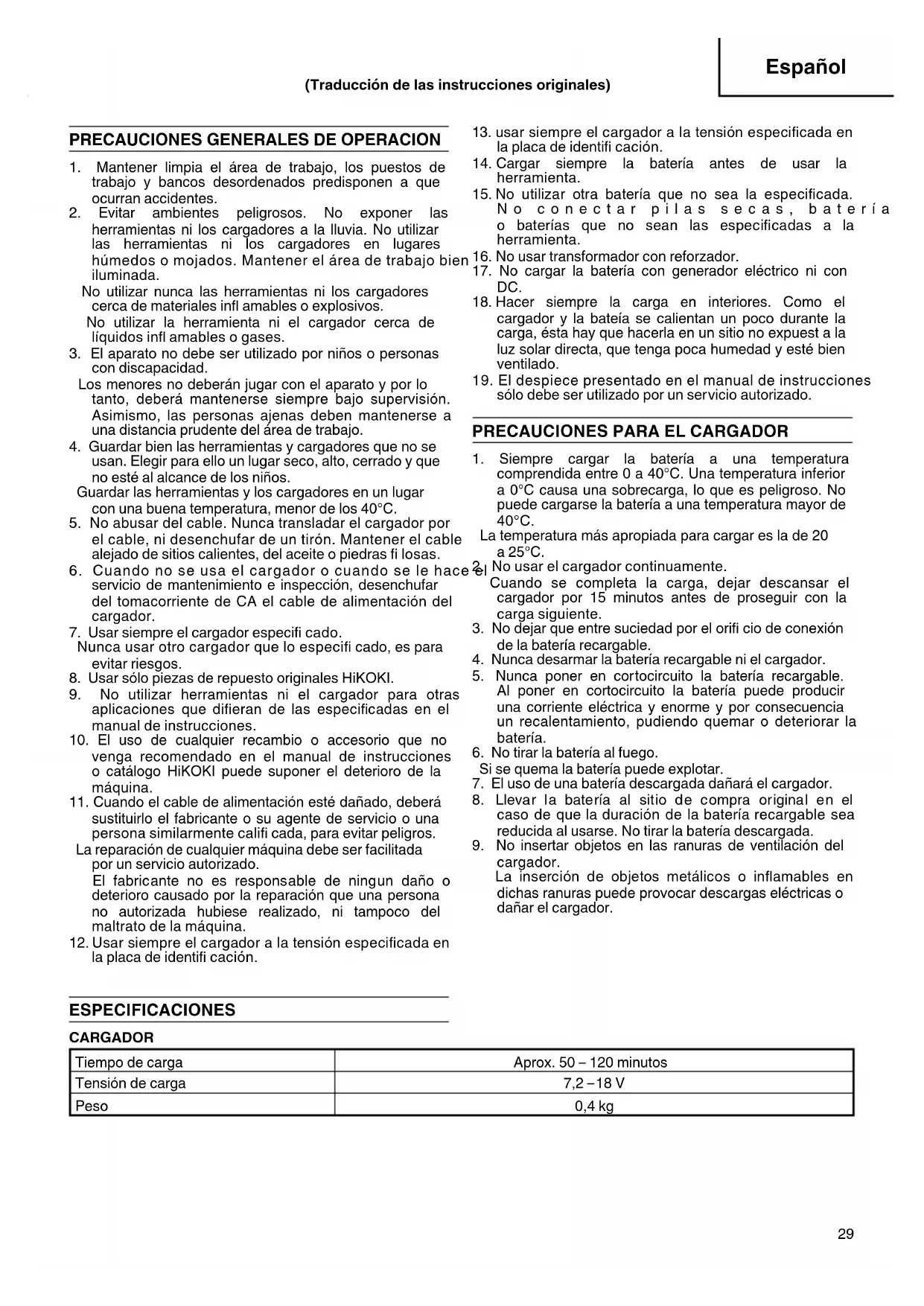Cuando no use el cargador, guardarlo en un lugar seco, alto o cerrado, fuera del alcance de los niños. PRECAUCIÓN En el manejo y el mantenimiento de las herramientas eléctricas, se deberán observar las normas y reglamentos vigentes en cada país. NOTA Debido al programa continuo de investigación y desarrollo de HiKOKI estas especifi caciones están sujetas a cambio sin previo aviso. Español