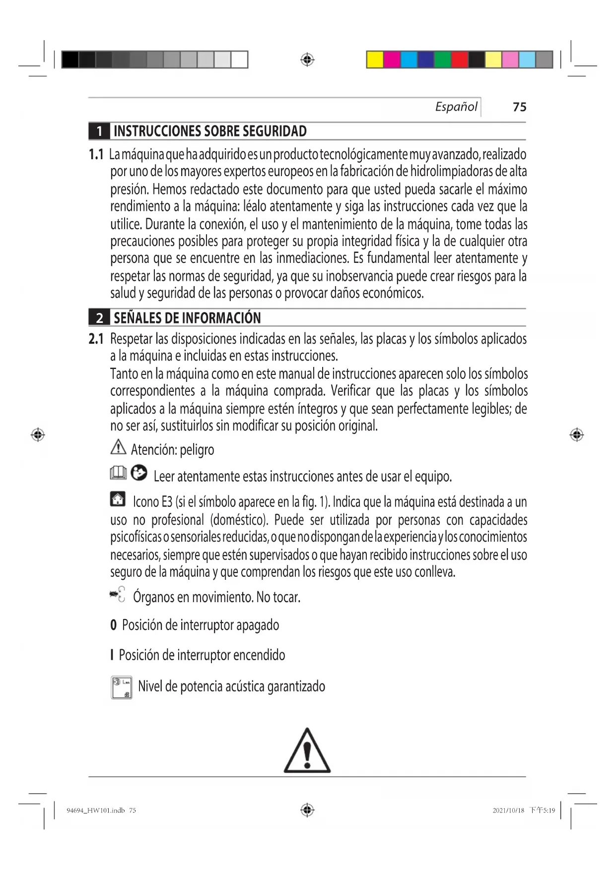 a la máquina e incluidas en estas instrucciones. Tanto en la máquina como en este manual de instrucciones aparecen solo los símbolos correspondientes a la máquina comprada. Verificar que las placas y los símbolos aplicados a la máquina siempre estén íntegros y que sean perfectamente legibles; de no ser así, sustituirlos sin modificar su posición original. Atención: peligro Leer atentamente estas instrucciones antes de usar el equipo. Icono E3 (si el símbolo aparece en la fig. 1). Indica que la máquina está destinada a un uso no profesional (doméstico). Puede ser utilizada por personas con capacidades psicofísicas o sensoriales reducidas, o que no dispongan de la experiencia y los conocimientos necesarios, siempre que estén supervisados o que hayan recibido instrucciones sobre el uso seguro de la máquina y que comprendan los riesgos que este uso conlleva. Órganos en movimiento. No tocar. 0 Posición de interruptor apagado I Posición de interruptor encendido Nivel de potencia acústica garantizado 94694_HW101.indb 7594694_HW101.indb 75 2021/10/18 下午5:192021/10/18 下午5:1976 Español Prohibición: le indica al usuario que es posible que las normas nacionales prohíban la conexión del producto a la red de abastecimiento de agua potable. Señal de peligro: le indica al usuario que no dirija el chorro de agua hacia personas, animales, equipos eléctricos ni contra el producto mismo. Este producto lleva aislamiento de Clase II, lo que significa que está equipado con un aislamiento reforzado o doble (solo si el símbolo está presente en la máquina). Este producto cumple con las directivas europeas aplicables en la materia. Icono E1. Indica que la máquina no se puede eliminar como residuo urbano; se le puede entregar al distribuidor al comprar una máquina nueva. Las partes eléctricas y electrónicas que constituyen la máquina no deben reutilizarse para usos impropios, dada la presencia de sustancias nocivas para la salud. Sólo para países de la Unión Europea Debido a la presencia de componentes peligrosos en el equipo, el equipo eléctrico y electrónico desechado puede tener un impacto negativo para el medioambiente y la salud humana. ¡No tire los aparatos eléctricos y electrónicos junto con los residuos domésticos! De conformidad con las Directivas Europeas sobre residuos de aparatos eléctricos y electrónicos, y su adaptación a la ley nacional, el equipo eléctrico y electrónico desechado deberá ser recogido por separado y trasladado a un punto distinto de recogida de desechos municipales, que cumpla con los reglamentos de protección medioambiental. Esto se indica mediante el símbolo de cubo de basura tachado colocado en el equipo. Llevar auriculares de protección. Llevar máscara de protección. Llevar equipos de protección respiratoria. Llevar guantes de protección. Llevar calzado de seguridad. Llevar ropa de protección. 94694_HW101.indb 7694694_HW101.indb 76 2021/10/18 下午5:192021/10/18 下午5:1977 Español