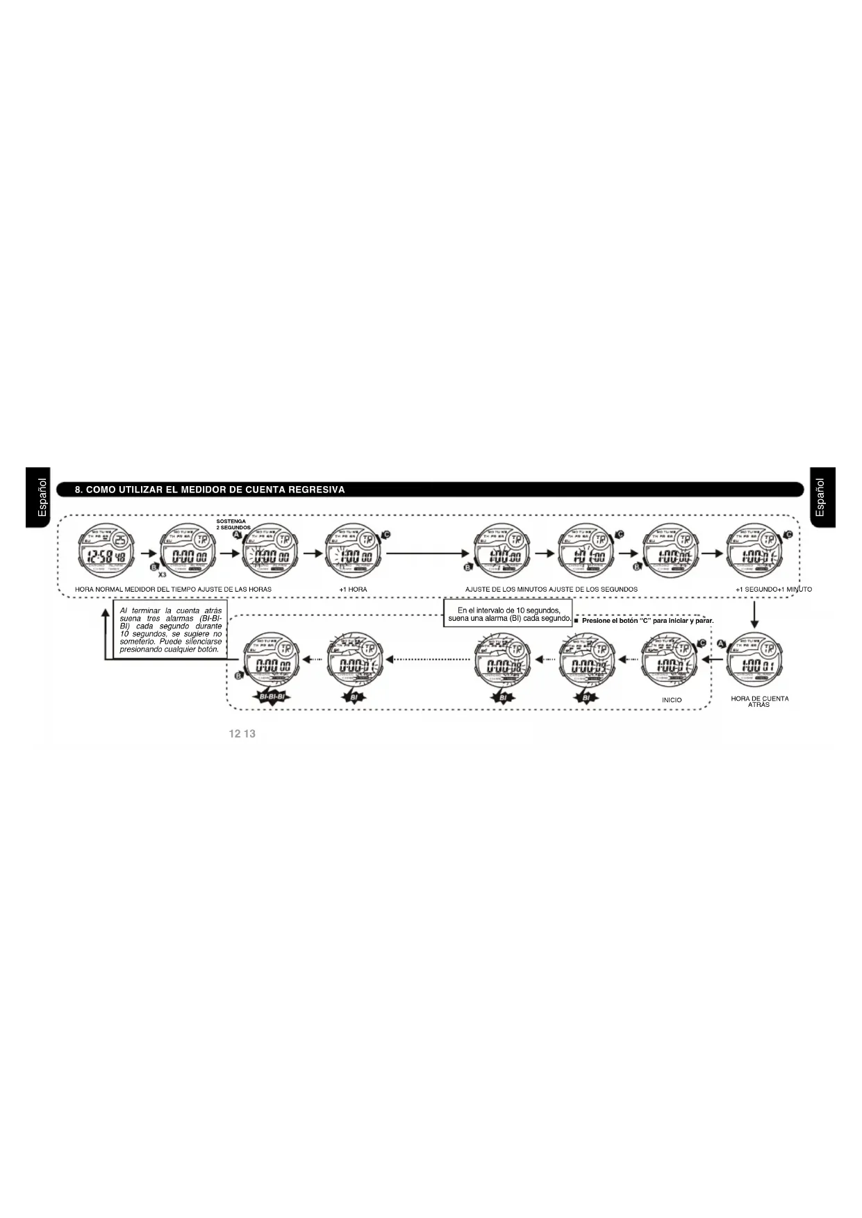 ATRÁS INICIO En el intervalo de 10 segundos, suena una alarma (BI) cada segundo. AJUSTE DE LOS MINUTOS AJUSTE DE LOS SEGUNDOS Presione el botón “C” para iniciar y parar.14 15 Español Español