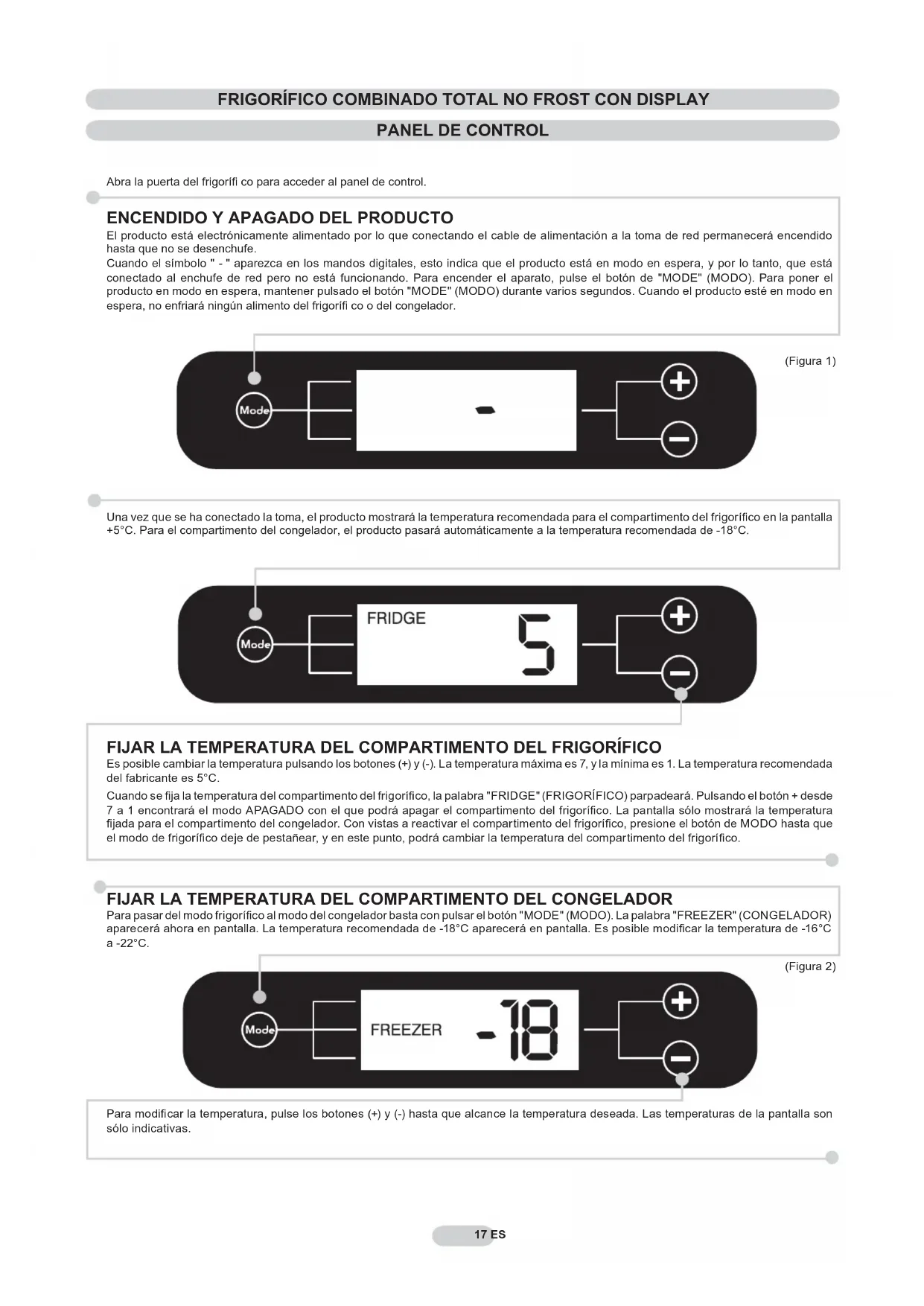 El producto está electrónicamente alimentado por lo que conectando el cable de alimentación a la toma de red permanecerá encendido hasta que no se desenchufe. Cuando el símbolo " - " aparezca en los mandos digitales, esto indica que el producto está en modo en espera, y por lo tanto, que está conectado al enchufe de red pero no está funcionando. Para encender el aparato, pulse el botón de "MODE" (MODO). Para poner el producto en modo en espera, mantener pulsado el botón "MODE" (MODO) durante varios segundos. Cuando el producto esté en modo en espera, no enfriará ningún alimento del frigorífi co o del congelador. FIJAR LA TEMPERATURA DEL COMPARTIMENTO DEL FRIGORÍFICO Es posible cambiar la temperatura pulsando los botones (+) y (-). La temperatura máxima es 7, y la mínima es 1. La temperatura recomendada del fabricante es 5°C. Cuando se fi ja la temperatura del compar timento del frigorífi co, la palabra "FRIDGE" (FRIGORÍFICO) parpadeará. Pulsando el botón + desde 7 a 1 encontrará el modo APAGADO con el que podrá apagar el compartimento del frigorífi co. La pantalla sólo mostrará la temperatura fi jada para el compartimento del congelador. Con vistas a reactivar el compartimento del frigorífi co, presione el botón de MODO hasta que el modo de frigorífi co deje de pestañear, y en este punto, podrá cambiar la temperatura del compartimento del frigorífi co. FIJAR LA TEMPERATURA DEL COMPARTIMENTO DEL CONGELADOR Para pasar del modo frigorífi co al modo del congelador basta con pulsar el botón "MODE" (MODO). La palabra "FREEZER" (CONGELADOR) aparecerá ahora en pantalla. La temperatura recomendada de -18°C aparecerá en pantalla. Es posible modifi car la temperatura de -16°C a -22°C. Para modifi car la temperatura, pulse los botones (+) y (-) hasta que alcance la temperatura deseada. Las temperaturas de la pantalla son sólo indicativas. (Figura 1) (Figura 2) Una vez que se ha conectado la toma, el producto mostrará la temperatura recomendada para el compartimento del frigorífi co en la pantalla +5°C. Para el compartimento del congelador, el producto pasará automáticamente a la temperatura recomendada de -18°C.18 ES OPZIONE SUPER