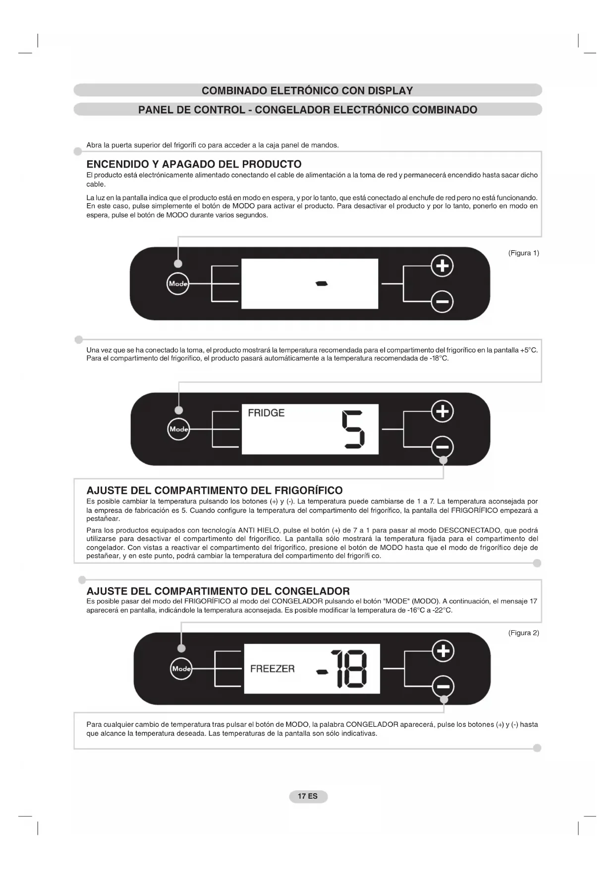 Es posible pasar del modo del FRIGORÍFICO al modo del CONGELADOR pulsando el botón "MODE" (MODO). A continuación, el mensaje 17 aparecerá en pantalla, indicándole la temperatura aconsejada. Es posible modifi car la temperatura de -16°C a -22°C. Para cualquier cambio de temperatura tras pulsar el botón de MODO, la palabra CONGELADOR aparecerá, pulse los botones (+) y (-) hasta que alcance la temperatura deseada. Las temperaturas de la pantalla son sólo indicativas. (Figura 1) (Figura 2) 17IT 17 ES Una vez que se ha conectado la toma, el producto mostrará la temperatura recomendada para el compartimento del frigorífi co en la pantalla +5°C. Para el compartimento del frigorífi co, el producto pasará automáticamente a la temperatura recomendada de -18°C.18IT 18 ES OPCIÓN SÚPERCONGELADO/ OPCIÓN SÚPER - CONGELADOR ELECTRÓNICO COMBINADO OPCIÓN SÚPERFALLOS Y ERRORES - COMBINADO ELECTRÓNICO Cada error o fallo aparecerá indicado automáticamente en la pantalla, en donde se mostrará un número precedido de la letra "E"(Error). En este caso, intente apagar el producto y vuelva a encenderlo de nuevo. Si el error persiste, póngase en contacto con la asistencia técnica. Para los productos equipados con tecnología SIN HIELO, tras un corte de alimentación, el mensaje "PF” (Fallo energético) aparecerá en pantalla. Si la interrupción de electricidad durante más de 10 o 12 horas, compruebe que los alimentos permanecen en buen estado para poder consumirlos en un plazo de 24 horas, cocinarlos o congelarlos. (Figura 4) (Figura 5) (Figura 3) Apagado Encendido Los productos ELECTRÓNICOS sin tecnología ANTI HIELO: Pulse el botón (+) para poder activar la función SÚPER. Coloque los alimentos que desea congelar en el compartimento del congelador. Al fi nal del tiempo confi gurado, el producto saldrá automáticamente de la función SÚPER. Si desea interrumpir la función SÚPER de forma anticipada, pulse el botón (-). Los productos ELECTRÓNICOS con tecnología ANTI HIELO: Pulse el botón (+) para poder activar la función SÚPER. Al cabo de 8 horas, coloque los alimentos que desea congelar en el compartimento del congelador. Al fi nal del tiempo confi gurado, el producto saldrá automáticamente de la función SÚPER. Si desea interrumpir la función SÚPER de forma anticipada, pulse el botón (-). La placa indicadora muestra la cantidad máxima de comida que puede ser congelada, (véase fi gura 6). Pulse el botón de modo repetidamente hasta que aparezca el mensaje SÚPER. Si la interrupción de electricidad durante más de 10 o 12 horas, compruebe que los alimentos permanecen en buen estado para poder consumirlos en un plazo de 24 horas, cocinarlos o congelarlos.