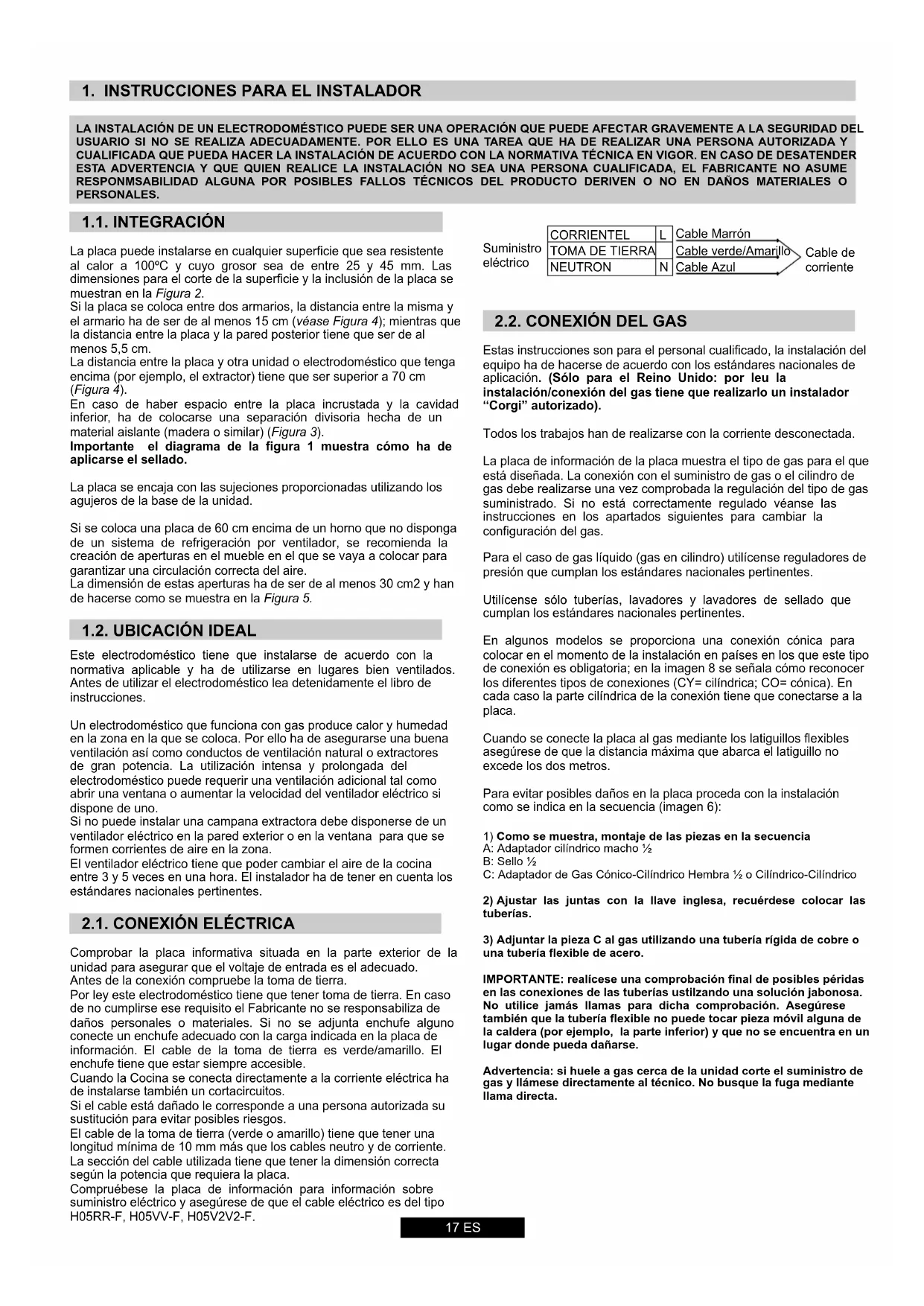 Comprobar la placa informativa situada en la parte exterior de la unidad para asegurar que el voltaje de entrada es el adecuado. Antes de la conexión compruebe la toma de tierra. Por ley este electrodoméstico tiene que tener toma de tierra. En caso de no cumplirse ese requisito el Fabricante no se responsabiliza de daños personales o materiales. Si no se adjunta enchufe alguno conecte un enchufe adecuado con la carga indicada en la placa de información. El cable de la toma de tierra es verde/amarillo. El enchufe tiene que estar siempre accesible. Cuando la Cocina se conecta directamente a la corriente eléctrica ha de instalarse también un cortacircuitos. Si el cable está dañado le corresponde a una persona autorizada su sustitución para evitar posibles riesgos. El cable de la toma de tierra (verde o amarillo) tiene que tener una longitud mínima de 10 mm más que los cables neutro y de corriente. La sección del cable utilizada tiene que tener la dimensión correcta según la potencia que requiera la placa. Compruébese la placa de información para información sobre suministro eléctrico y asegúrese de que el cable eléctrico es del tipo H05RR-F, H05VV-F, H05V2V2-F. CORRIENTEL