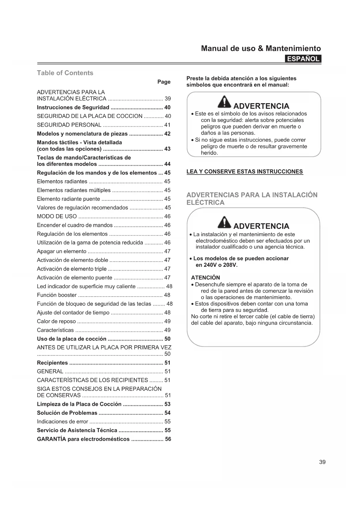ADVERTENCIA Para reducir el riesgo de quemaduras en el uso de la placa siga estos consejos: x No utilice jamás la placa de cocción para calentar una habitación. x No deje a niños o mascotas solos en una habitación en la que haya electrodomésticos en funcionamiento. No permita que se sienten o apoyen en ninguna parte del electrodoméstico. ATENCIÓN No almacene objetos que puedan llamar la atención de los niños ni en los armarios que se encuentren sobre el electrodoméstico ni en la parte posterior: los niños podrían resultar gravemente heridos si intentaran alcanzarlos. Cuando utilice la placa de cocción x No toque la superficie de los fuegos ni la zona de alrededor. La superficie puede emitir calor suficiente para causar quemaduras. Los elementos de la superficie pueden estar calientes incluso cuando están de color oscuro. No toque la superficie de la placa ni permita que ningún material inflamable entre en contacto con ella mientras esté caliente. Cuando utilice la placa de cocción sobra el horno x No toque los elementos térmicos o las superficies interiores del horno. Los elementos térmicos pueden estar calientes aunque estén de color oscuro. Las superficies interiores de un horno emiten y retienen calor suficiente para provocar quemaduras. No toque los elementos térmicos ni las superficies interiores del horno, ni permita que ningún material inflamabe o tejido entre en contacto con ellos durante el uso del electrodoméstico o mientras este esté caliente. Hay otras superficies del electrodoméstico que pueden calentarse lo suficiente como para provocar quemaduras; entre estas se encuentran, por ejemplo, las aberturas de ventilación del horno y las superficies de alrededor, las puertas del horno y los cristales de las puertas del horno). x Para minimizar el riesgo de quemaduras, salpicaduras y de incendio, mantenga el mango de la sartén o recipiente que esté utilizando en el centro de la placa de cocción, pero no encima de un fuego. x Utilice únicamente recipientes adecuados para la placa de cocción, como determinados tipos de cristal, cerámica vidriada refractaria, barro u otros recipientes vitrificados.ESPAÑOL Manual de uso & Mantenimiento