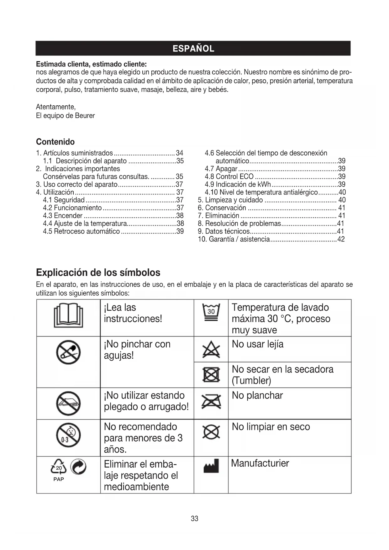 Estimada clienta, estimado cliente: nos alegramos de que haya elegido un producto de nuestra colección. Nuestro nombre es sinónimo de pro- ductos de alta y comprobada calidad en el ámbito de aplicación de calor, peso, presión arterial, temperatura corporal, pulso, tratamiento suave, masaje, belleza, aire y bebés. Atentamente, El equipo de Beurer34 Este producto cum- ple los requisitos de las directrices euro