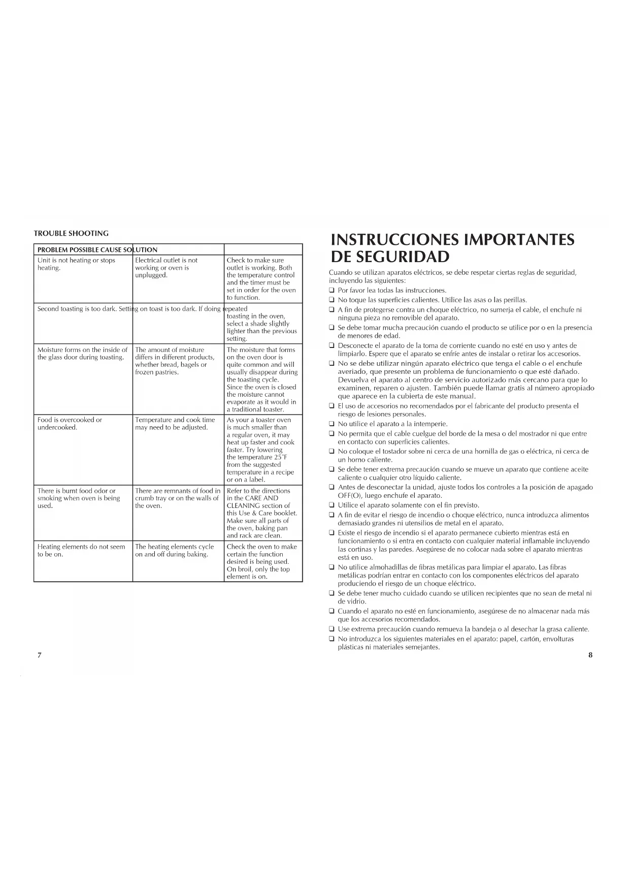 El aparato no calienta o deja de calentar. La toma de corriente no funciona o el horno está desconectado. Verique que la toma de corriente esté funcionando. Tanto el control de temperatura como el cronómetro deben ser ajustados para que el horno funcione. La segunda tanda de tostado resulta muy oscura. El control del grado de tostado está a un nivel demasiado alto. Si repite varias tandas, escoja un grado de tostado más bajo que el anterior. Se forma humedad por dentro en la puerta de vidrio durante el ciclo de tostado. La cantidad de humedad varía entre un producto y otro según los productos; pan, bagels, pasteles etc. La humedad que se forma por dentro en la puerta del horno es bastante común y generalmente desaparece durante el ciclo de tostado. Como la puerta permanece cerrada, la humedad no se puede evaporar como en un tostador normal. Los alimentos se sobre cocinan o no se cocinan bien. La temperatura y el tiempo de cocción pueden requerir reajuste. Como un horno tostador es mucho más pequeño que un horno regular, puede que se caliente y cocine más rápido. Ensaye, reduciendo 25˚F la temperatura indicada en la receta o en el paquete. El aparato despide olor a comida quemada o humea cuando está en funcionamiento. Hay residuos de comida en la bandeja de recolección o en las paredes del horno. Consulte las instrucciones en la sección de CUIDADO Y LIMPIEZA de este manual. Asegúrese de que todas las partes del horno, bandeja de hornear y parrilla estén limpias. Los elementos calefactores parecen no estar encendidos. Los elementos calefactores funcionan intermitentemente durante el ciclo de cocción. Asegúrese que el aparato esté ajustado a la función correcta. Para el caso, cuando uno asa los alimentos, solamente se enciende el elemento calefactor superior.Lorsqu’on utilise un appareil électrique, il faut toujours respecter certaines règles de sécurité fondamentales, notamment les suivantes.