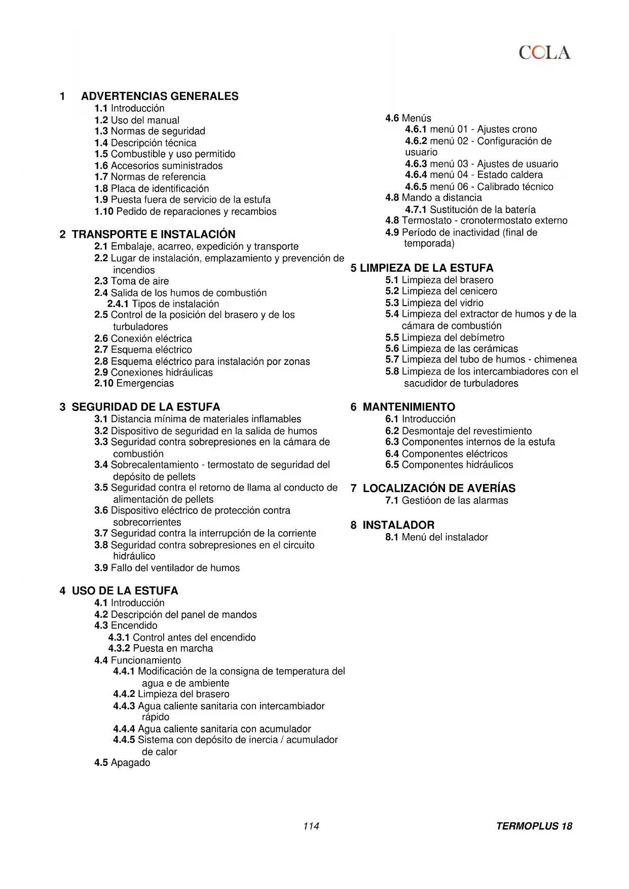 - Leer este manual antes de realizar operaciones de instalación, uso y mantenimiento de la estufa. - Hacer realizar la instalación, la conexión eléctrica, la prueba y el mantenimiento por un técnico autorizado. - Conectar la estufa a una chimenea según normas a través de un terminal inspeccionable. La conexión de varios aparatos a una misma chimenea debe estar autorizada por las normas locales y por el organismo de control de este tipo de sistemas. - Conectar la estufa a la aspiración mediante un tubo o toma de aire desde el exterior. - Conectar la estufa a una toma de corriente homologada de 230 V - 50 Hz. - En el modelo TERMO, conectar el equipo a la instalación de calefacción. No utilizarlo en ningún caso sin la conexión hidráulica y sin cargar agua en la cámara térmica. - Controlar que la instalación eléctrica y las tomas de corriente tengan capacidad para soportar la absorción máxima del equipo, indicada en la placa y en este manual. - Antes de hacer cualquier operación de mantenimiento, desconectar la estufa de la corriente eléctrica y dejar que se enfríe. - No utilizar líquidos o sustancias inflamables para encender la estufa o reavivar la llama: con la estufa en marcha, los pellets se encienden automáticamente. - Alimentar la estufa exclusivamente con pellets de madera que tengan las características descritas en este manual. - No utilizar la estufa como incinerador de residuos. - No cerrar en ningún caso las entradas de aire comburente ni las salidas de humos. - No manipular sustancias fácilmente inflamables o explosivas cerca de la estufa encendida. - No quitar la rejilla de protección del depósito de pellets. - No utilizar la estufa con la puerta de la cámara de combustión abierta o con el vidrio rajado o roto. - Durante el funcionamiento, el intenso calor generado por la combustión de los pellets calienta las superficies externas de la estufa, en particular la puerta de la cámara, la manija y el tubo de salida de humos. Evitar el contacto con dichas partes sin una protección adecuada. - Mantener a una distancia prudencial los objetos inflamables o que no resistan al calor. - Limpiar correctamente el brasero a cada encendido o recarga de pellets. - Evitar la formación de humo y de material inquemado durante el encendido y el funcionamiento. Si se acumula mucho pellet sin quemar en el brasero, quitarlo manualmente antes del próximo encendido. - Hacer limpiar el conducto y los deflectores de humo, dentro de la cámara de combustión, por un técnico autorizado. - Advertir a los niños y huéspedes de los peligros anteriormente descritos. - En caso de anomalías de funcionamiento, no reencender la estufa hasta que se haya resuelto la causa del problema. - Las modificaciones de la estufa o el uso de recambios no originales sin la debida autorización pueden poner al usuario en peligro, ante lo cual el fabricante queda exento de responsabilidad civil o penal. - Utilizar solo recambios originales indicados por el fabricante. El fabricante no asume ninguna responsabilidad por inconvenientes, roturas o accidentes debidos a la inobservancia de las indicaciones dadas en el presente manual.116 TERMOPLUS 18