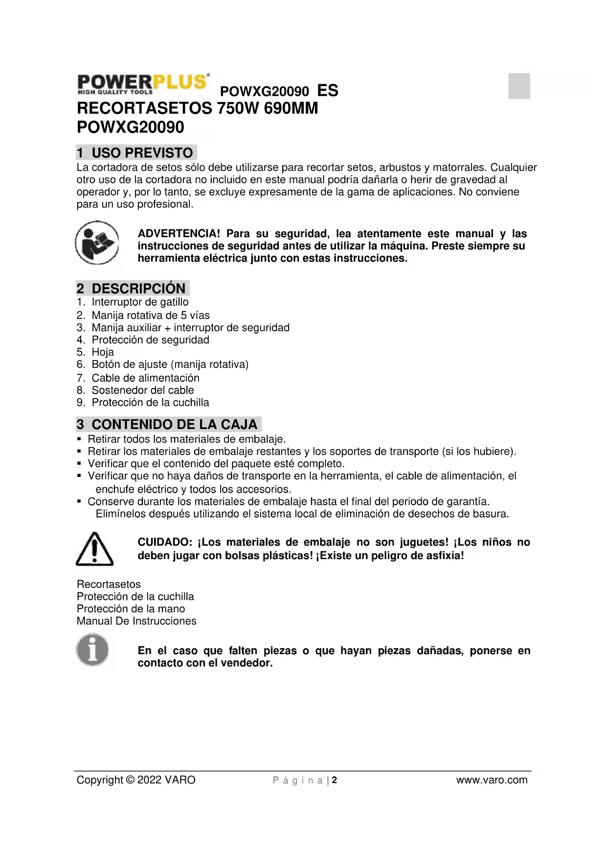 - Conserve durante los materiales de embalaje hasta el final del periodo de garantía. Elimínelos después utilizando el sistema local de eliminación de desechos de basura. CUIDADO: ¡Los materiales de embalaje no son juguetes! ¡Los niños no deben jugar con bolsas plásticas! ¡Existe un peligro de asfixia! Recortasetos Protección de la cuchilla Protección de la mano Manual De Instrucciones En el caso que falten piezas o que hayan piezas dañadas, ponerse en contacto con el vendedor.POWXG20090 ES Copyright © 2022 VARO P á g i n a | 3 www.varo.com 4 SÍMBOLOS En este manual y/o en el aparato mismo se utilizan los siguientes símbolos: