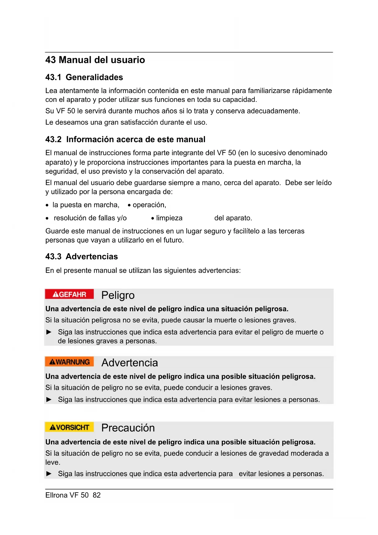 Precaución Una advertencia de este nivel de peligro indica una posible situación peligrosa. Si la situación de peligro no se evita, puede conducir a lesiones de gravedad moderada a leve. ► Siga las instrucciones que indica esta advertencia para evitar lesiones a personas.Ellrona VF 50 83