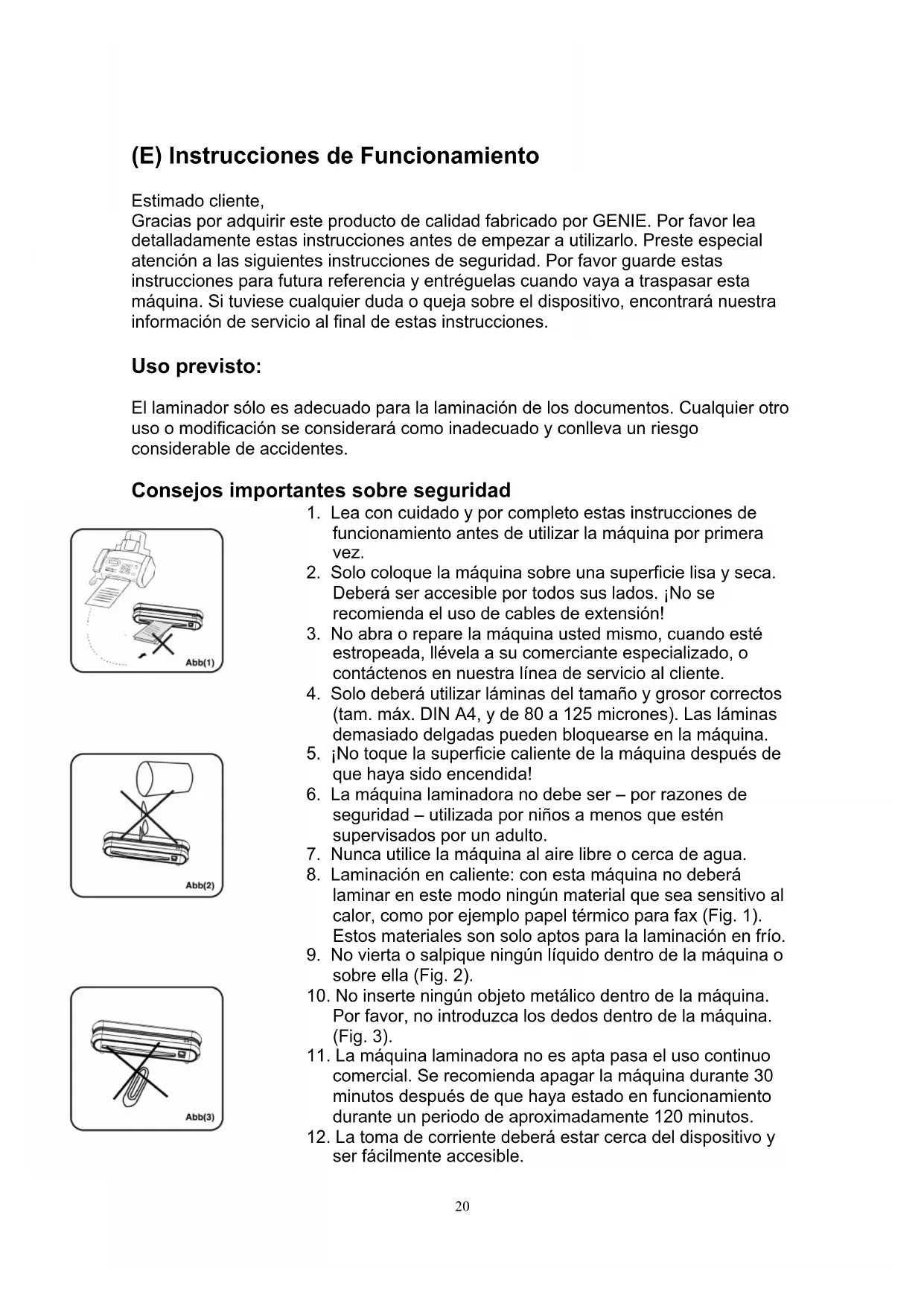 (E) Instrucciones de Funcionamiento Estimado cliente, Gracias por adquirir este producto de calidad fabricado por GENIE. Por favor lea detalladamente estas instrucciones antes de empezar a utilizarlo. Preste especial atención a las siguientes instrucciones de seguridad. Por favor guarde estas instrucciones para futura referencia y entréguelas cuando vaya a traspasar esta máquina. Si tuviese cualquier duda o queja sobre el dispositivo, encontrará nuestra información de servicio al final de estas instrucciones. Uso previsto: El laminador sólo es adecuado para la laminación de los documentos. Cualquier otro uso o modificación se considerará como inadecuado y conlleva un riesgo considerable de accidentes. Consejos importantes sobre seguridad
