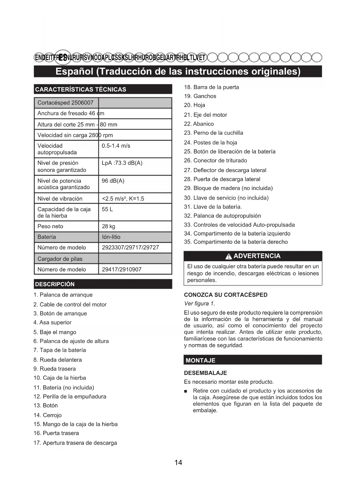 EN DE IT FR PT NL RU FI SV NO DA PL CS SK SL HR HU RO BG EL AR TR HE LT LV ET CARACTERÍSTICAS TÉCNICASCortacésped 2506007Anchura de fresado 46 cmAltura del corte 25 mm - 80 mmVelocidad sin carga 2800 rpmVelocidad autopropulsada0.5-1.4 m/sNivel de presión sonora garantizadoLpA :73.3 dB(A) Nivel de potenciaacústica garantizado96 dB(A)Nivel de vibración <2.5 m/s², K=1.5Capacidad de la caja de la hierba 55 L Peso neto 28 kgBatería Ión-litioNúmero de modelo 2923307/29717/29727Cargador de pilasNúmero de modelo 29417/2910907DESCRIPCIÓN1. Palanca de arranque2. Cable de control del motor3. Botón de arranque4. Asa superior5. Baje el mango6. Palanca de ajuste de altura7. Tapa de la batería8. Rueda delantera9. Rueda trasera10. Caja de la hierba11. Batería (no incluida)12. Perilla de la empuñadura13. Botón14. Cerrojo15. Mango de la caja de la hierba16. Puerta trasera17. Apertura trasera de descarga18. Barra de la puerta19. Ganchos20. Hoja21. Eje del motor22. Abanico23. Perno de la cuchilla24. Postes de la hoja25. Botón de liberación de la batería26. Conector de triturado27. Deflector de descarga lateral28. Puerta de descarga lateral29. Bloque de madera (no incluida)30. Llave de servicio (no incluida)31. Llave de la batería.32. Palanca de autopropulsión 33. Controles de velocidad Auto-propulsada34. Compartimento de la batería izquierdo35. Compartimento de la batería derecho ADVERTENCIA El uso de cualquier otra batería puede resultar en un riesgo de incendio, descargas eléctricas o lesiones personales. CONOZCA SU CORTACÉSPEDVer gura 1.El uso seguro de este producto requiere la comprensión de la información de la herramienta y del manual de usuario, así como el conocimiento del proyecto que intenta realizar. Antes de utilizar este producto, familiarícese con las características de funcionamiento y normas de seguridad.MONTAJEDESEMBALAJEEs necesario montar este producto. ■ Retire con cuidado el producto y los accesorios de la caja. Asegúrese de que están incluidos todos los elementos que figuran en la lista del paquete de embalaje. 14Español (Traducción de las instrucciones originales)