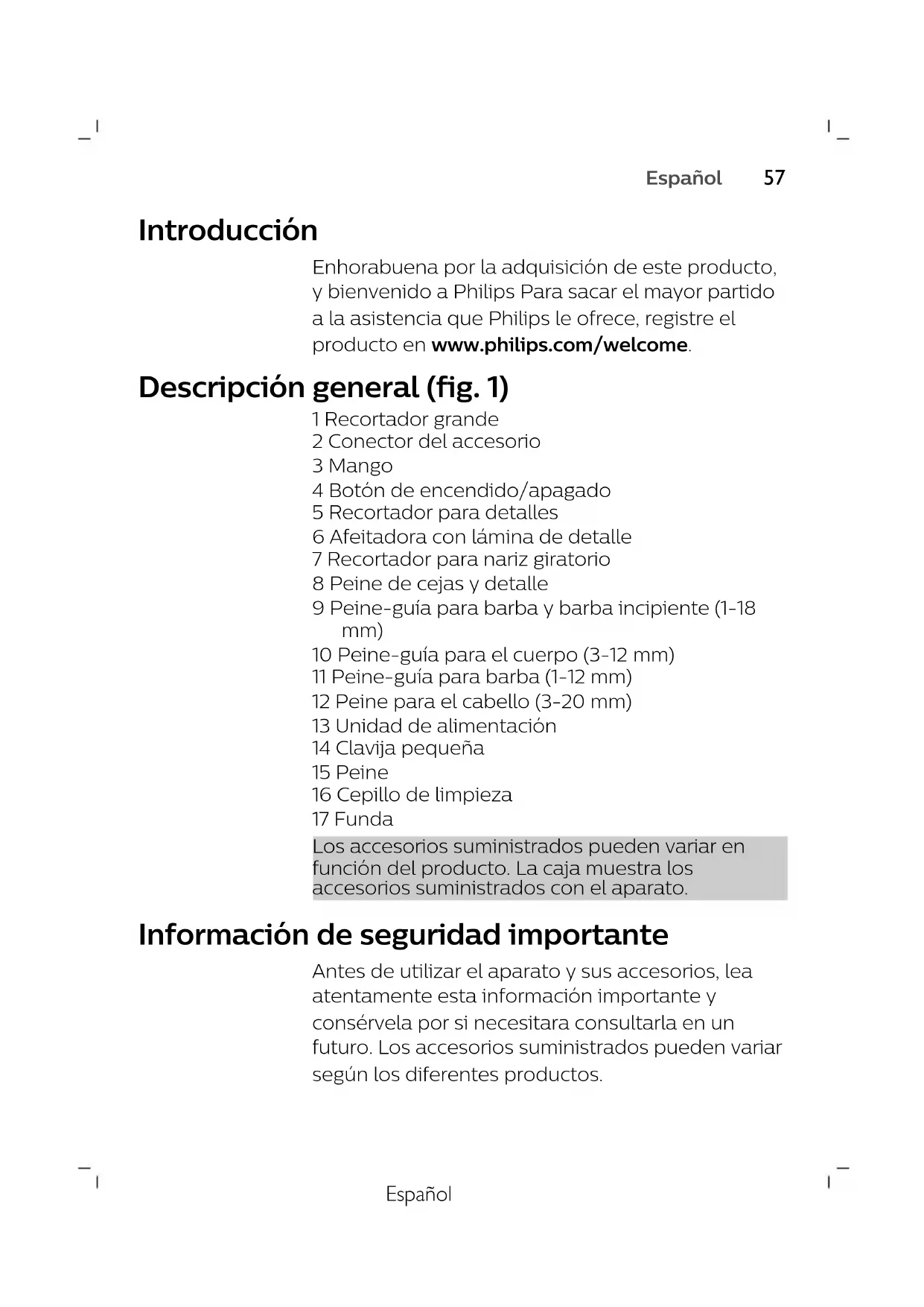 DeutschEspañol Introducción Enhorabuena por la adquisición de este producto, y bienvenido a Philips Para sacar el mayor partido a la asistencia que Philips le ofrece, registre el producto en www.philips.com/welcome. Descripción general (fig. 1) 1 Recortador grande 2 Conector del accesorio 3 Mango 4 Botón de encendido/apagado 5 Recortador para detalles 6 Afeitadora con lámina de detalle 7 Recortador para nariz giratorio 8 Peine de cejas y detalle 9 Peine-guía para barba y barba incipiente (1-18 mm) 10 Peine-guía para el cuerpo (3-12mm) 11 Peine-guía para barba (1-12 mm) 12 Peine para el cabello (3-20 mm) 13 Unidad de alimentación 14 Clavija pequeña 15 Peine 16 Cepillo de limpieza 17 Funda Los accesorios suministrados pueden variar en función del producto. La caja muestra los accesorios suministrados con el aparato. Información de seguridad importante Antes de utilizar el aparato y sus accesorios, lea atentamente esta información importante y consérvela por si necesitara consultarla en un futuro. Los accesorios suministrados pueden variar según los diferentes productos.