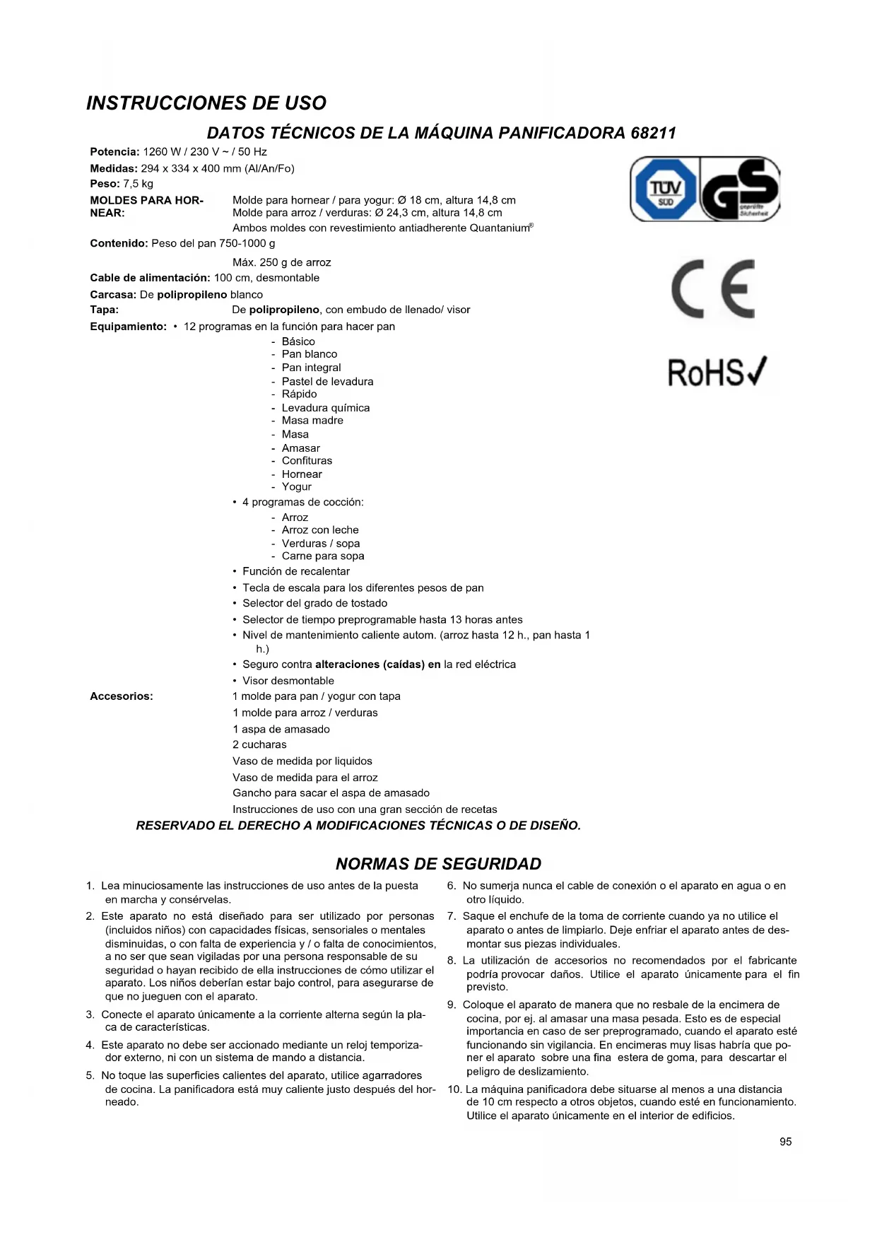 Contenido: Peso del pan 750-1000 g Máx. 250 g de arroz Cable de alimentación: 100 cm, desmontable Carcasa: De polipropileno blanco Tapa: De polipropileno, con embudo de llenado/ visor Equipamiento: • 12 programas en la función para hacer pan - Básico - Pan blanco - Pan integral - Pastel de levadura - Rápido - Levadura química - Masa madre - Masa - Amasar - Conturas - Hornear - Yogur