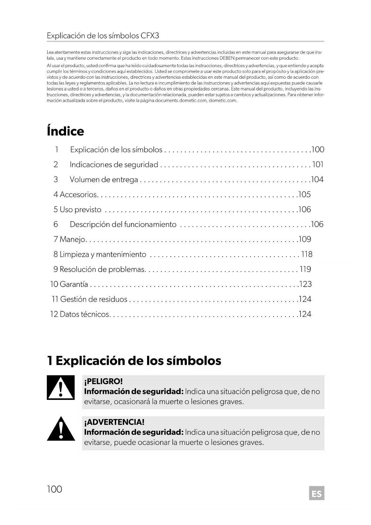 - Lea atentamente estas instrucciones y siga las indicaciones, directrices y advertencias incluidas en este manual para asegurarse de que ins- tala, usa y mantiene correctamente el producto en todo momento. Estas instrucciones DEBEN permanecer con este producto. Al usar el producto, usted confirma que ha leído cuidadosamente todas las instrucciones, directrices y advertencias, y que entiende y acepta cumplir los términos y condiciones aquí establecidos. Usted se compromete a usar este producto solo para el propósito y la aplicación pre- vistos y de acuerdo con las instrucciones, directrices y advertencias establecidas en este manual del producto, así como de acuerdo con todas las leyes y reglamentos aplicables. La no lectura e incumplimiento de las instrucciones y advertencias aquí expuestas puede causarle lesiones a usted o a terceros, daños en el producto o daños en otras propiedades cercanas. Este manual del producto, incluyendo las ins- trucciones, directrices y advertencias, y la documentación relacionada, pueden estar sujetos a cambios y actualizaciones. Para obtener infor- mación actualizada sobre el producto, visite la página documents.dometic.com, dometic.com. Índice 1 Explicación de los símbolos p. 100