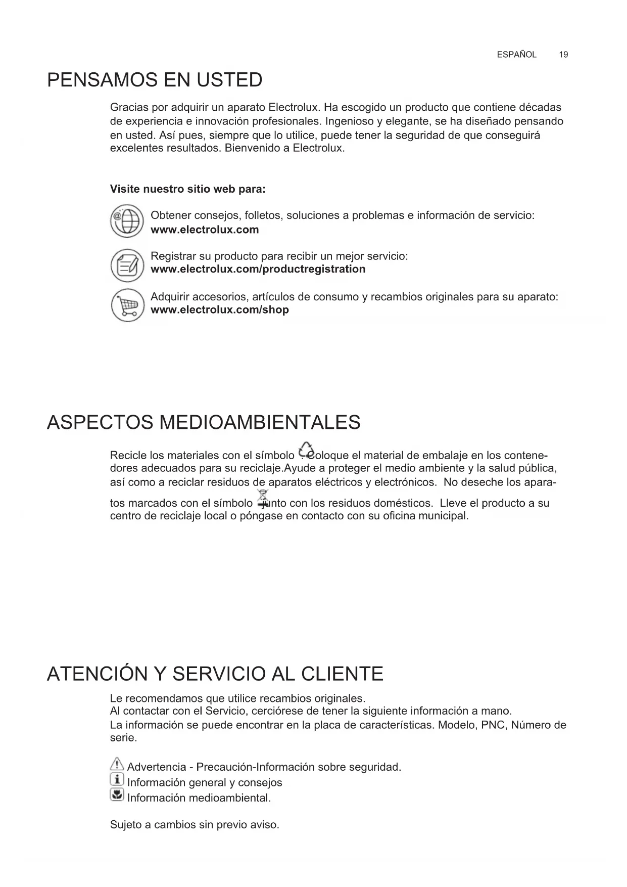 Le recomendamos que utilice recambios originales. Al contactar con el Servicio, cerciórese de tener la siguiente información a mano. La información se puede encontrar en la placa de características. Modelo, PNC, Número de serie. Advertencia - Precaución-Información sobre seguridad. Información general y consejos Información medioambiental. Sujeto a cambios sin previo aviso. ES MANUAL DE USOwww.electrolux.com