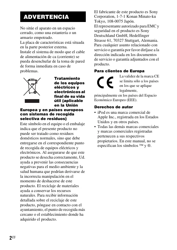 ADVERTENCIA No sitúe el aparato en un espacio cerrado, como una estantería o un armario empotrado. La placa de características está situada en la parte posterior externa. Instale el sistema de modo que el cable de alimentación de ca (corriente) se pueda desenchufar de la toma de pared de forma inmediata en caso de problemas. Tratamiento de los equipos eléctricos y electrónicos al final de su vida útil (aplicable en la Unión Europea y en países europeos con sistemas de recogida selectiva de residuos) Este símbolo en el equipo o el embalaje indica que el presente producto no puede ser tratado como residuos domésticos normales, sino que debe entregarse en el correspondiente punto de recogida de equipos eléctricos y electrónicos. Al asegurarse de que este producto se desecha correctamente, Ud. ayuda a prevenir las consecuencias negativas para el medio ambiente y la salud humana que podrían derivarse de la incorrecta manipulación en el momento de deshacerse de este producto. El reciclaje de materiales ayuda a conservar los recursos naturales. Para recibir información detallada sobre el reciclaje de este producto, póngase en contacto con el ayuntamiento, el punto de recogida más cercano o el establecimiento donde ha adquirido el producto. 2ES El fabricante de este producto es Sony Corporation, 1-7-1 Konan Minato-ku Tokyo, 108-0075 Japón. El representante autorizado para EMC y seguridad en el producto es Sony Deutschland GmbH, Hedelfinger Strasse 61, 70327 Stuttgart, Alemania. Para cualquier asunto relacionado con servicio o garantía por favor diríjase a la dirección indicada en los documentos de servicio o garantía adjuntados con el producto. Para clientes de Europa La validez de la marca CE se limita sólo a los países en los que se aplique legalmente, principalmente en los países del Espacio Económico Europeo (EEE). Derechos de autor