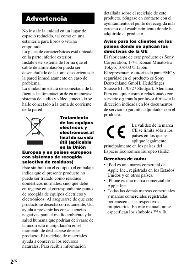 - Sony declina toda responsabilidad en caso de que se produzcan perdidas o días en los datos grabados en el iPod al utiliser conectado a esta�性.
