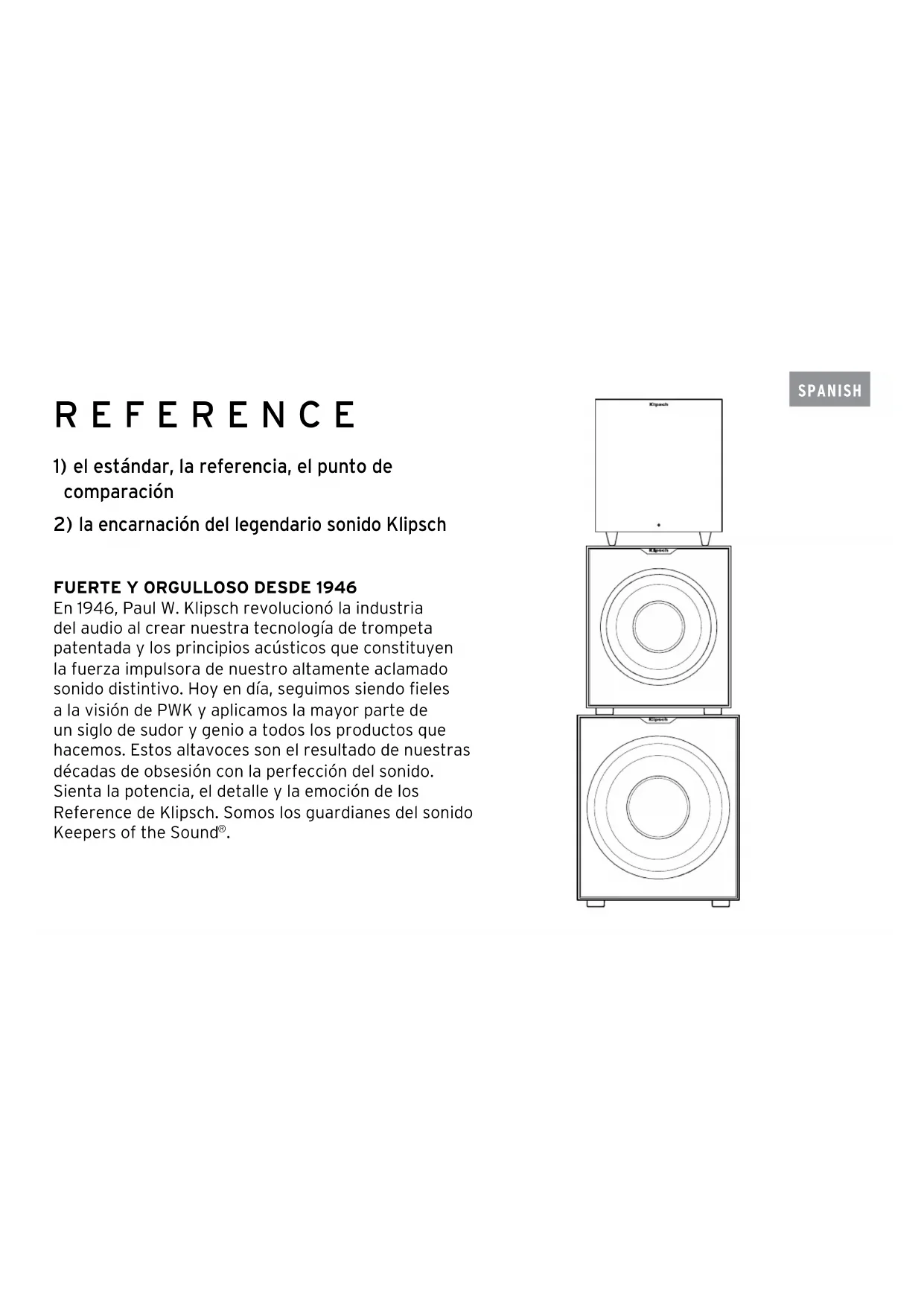 En 1946, Paul W. Klipsch revolucionó la industria del audio al crear nuestra tecnología de trompeta patentada y los principios acústicos que constituyen la fuerza impulsora de nuestro altamente aclamado sonido distintivo. Hoy en día, seguimos siendo fieles a la visión de PWK y aplicamos la mayor parte de un siglo de sudor y genio a todos los productos que hacemos. Estos altavoces son el resultado de nuestras décadas de obsesión con la perfección del sonido. Sienta la potencia, el detalle y la emoción de los Reference de Klipsch. Somos los guardianes del sonido Keepers of the Sound